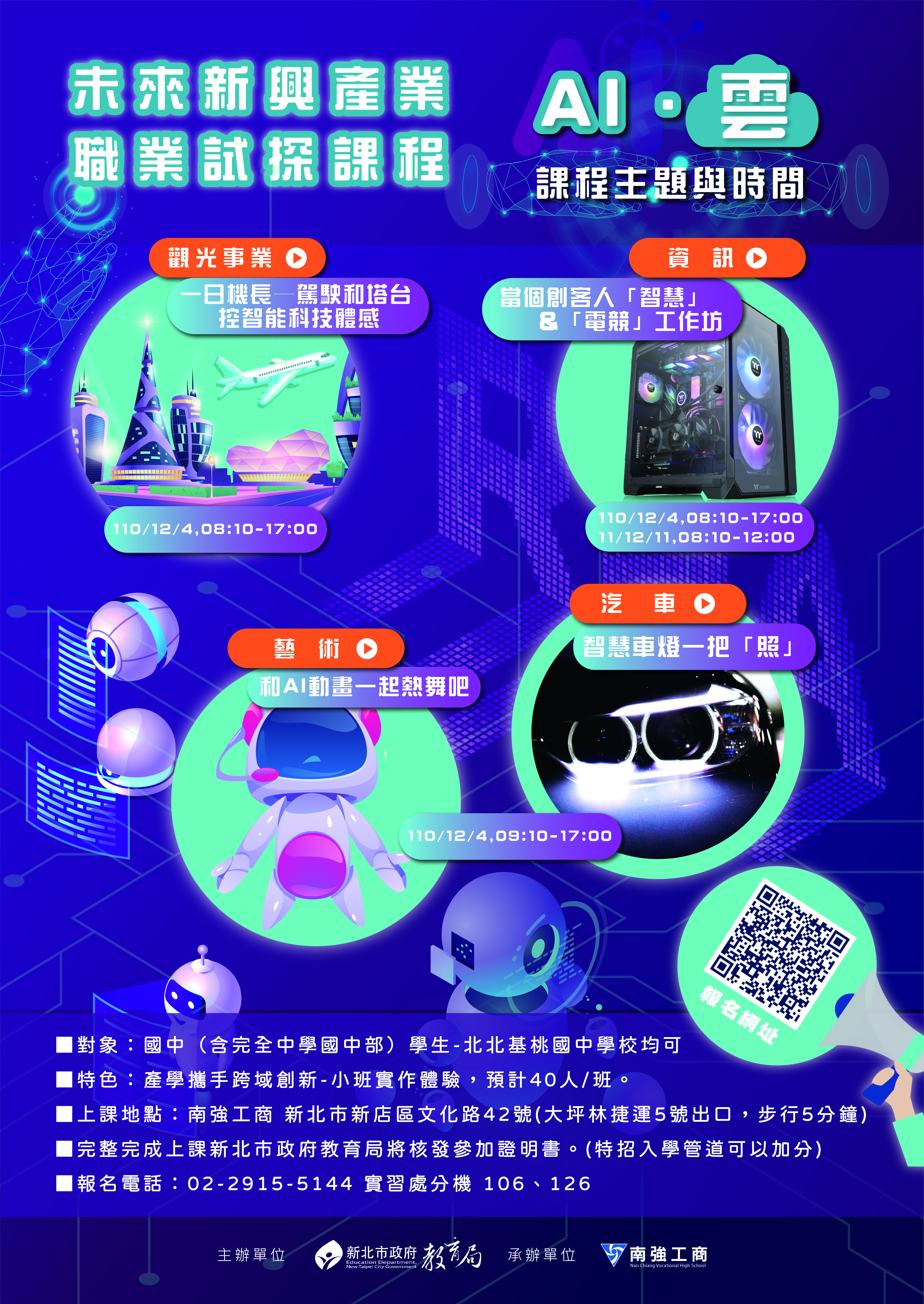 (二)當個創客人「智慧」&「電競」工作 坊—12月4日(六)8:10~17:00以及12月11日 (六)8:10~12:00(資訊科)。