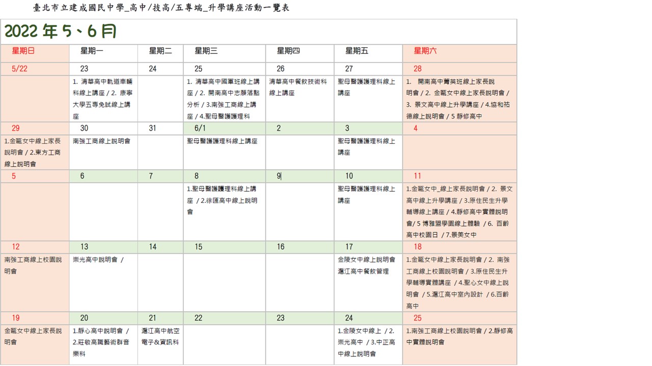| 臺北市立建成國民中學_高中/技高/五專端_升學講座活動_列表(輔導室資料組截至2022/6/20彙整) | ||||