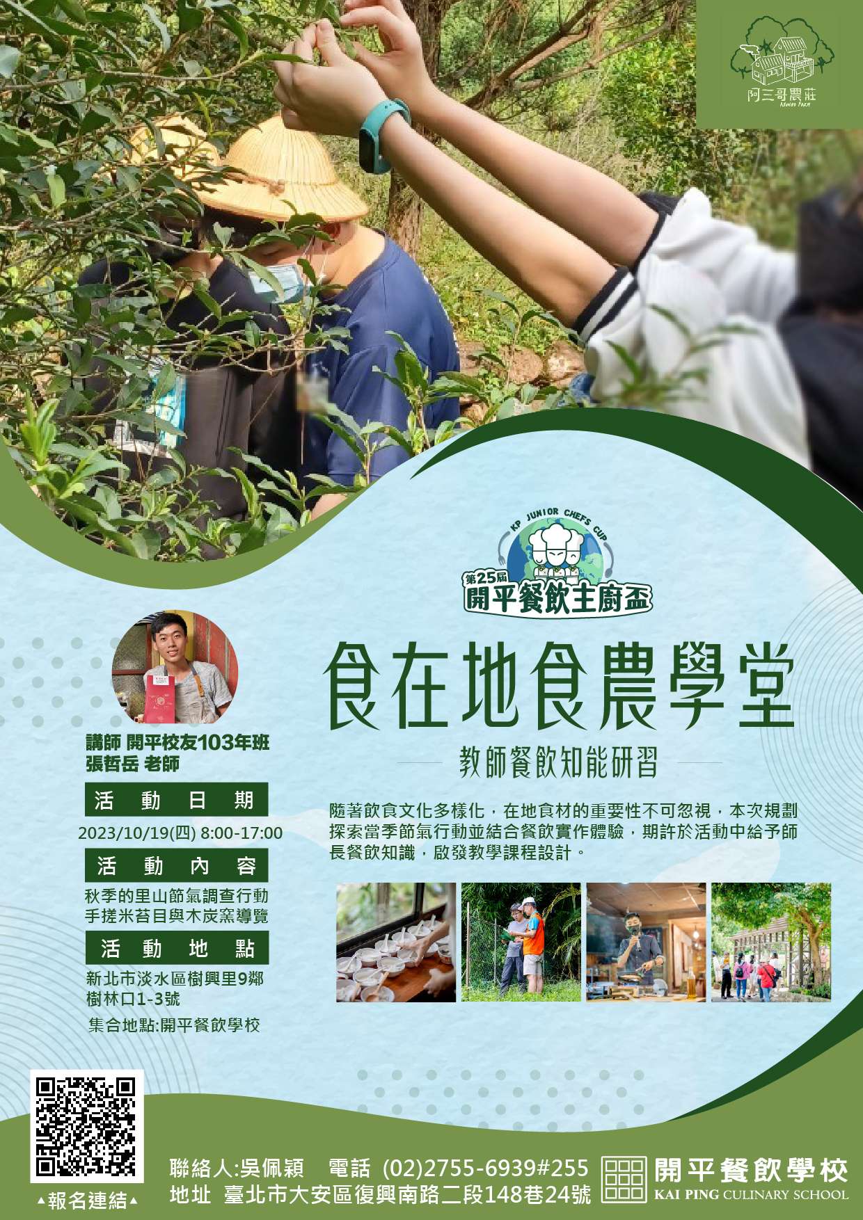 四、報名方式:採線上報名,請上”全國教師在職進修資訊網” 報名,課程名稱:食在地食農學堂-教師餐飲知能研習,課 程代碼:4043835。報名截止日期:2023/10/15,課程名單 將於開課前三天確認遴選名單。