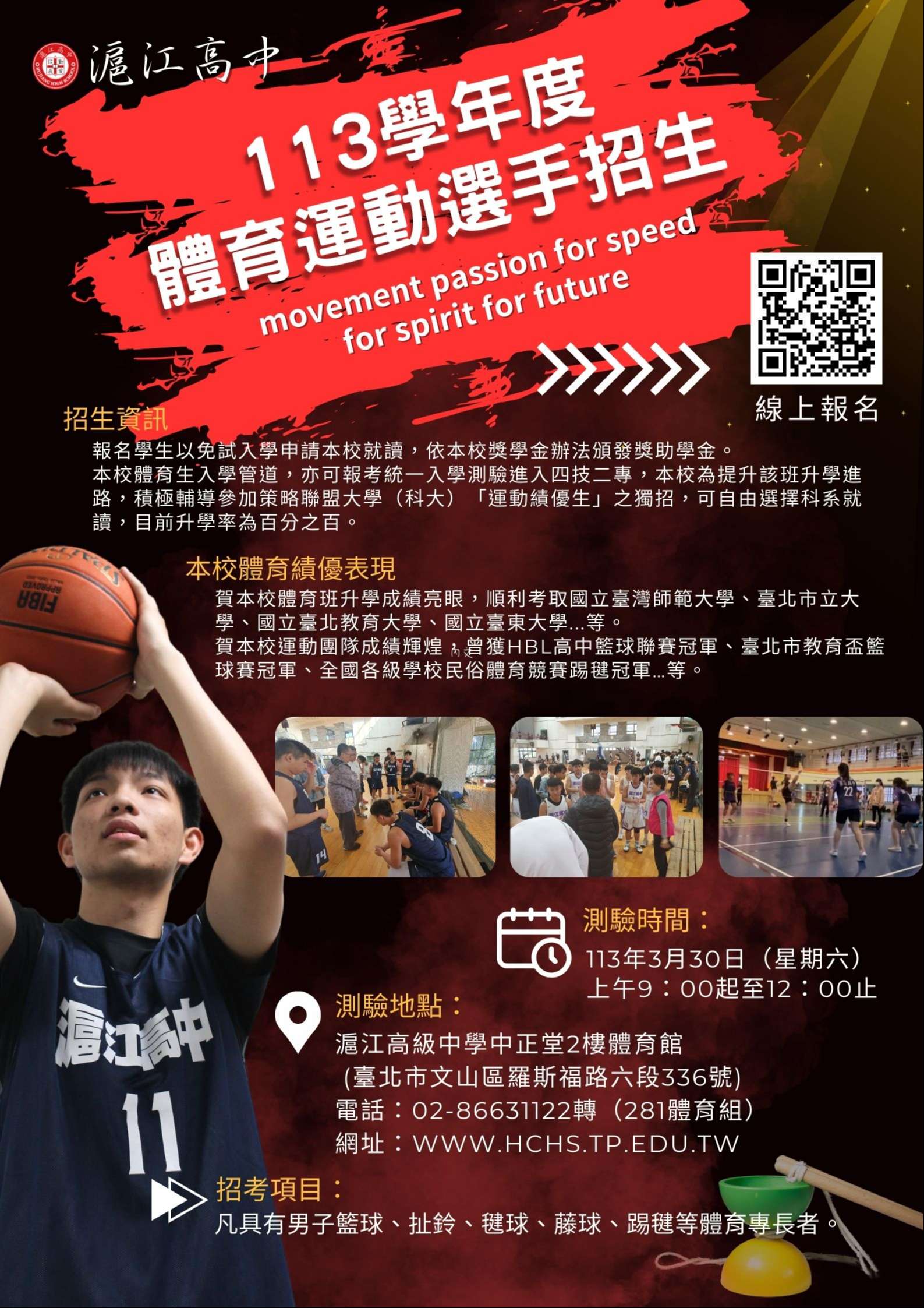 「臺北市私立滬江高級中學113學年度體育選手招生」簡章及招生海報