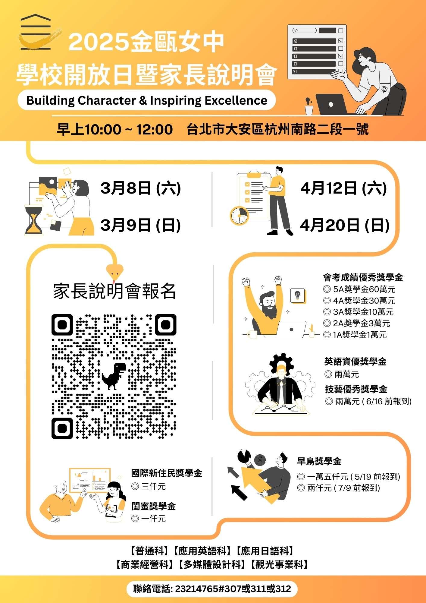 二、報名方式:即日起至114年4月12日(星期六)止,請逕至金 甌女中首頁(網址:https://www.cogsh.tp.edu.tw/home) 掃QR Code、或直接至Google表單(網址:https://https: //forms.gle/DHQJaG4gHAYqZwm78)報名參加。 三、敬請各教育伙伴學校協助宣傳,活動海報詳見附件,惠請 公告周知。