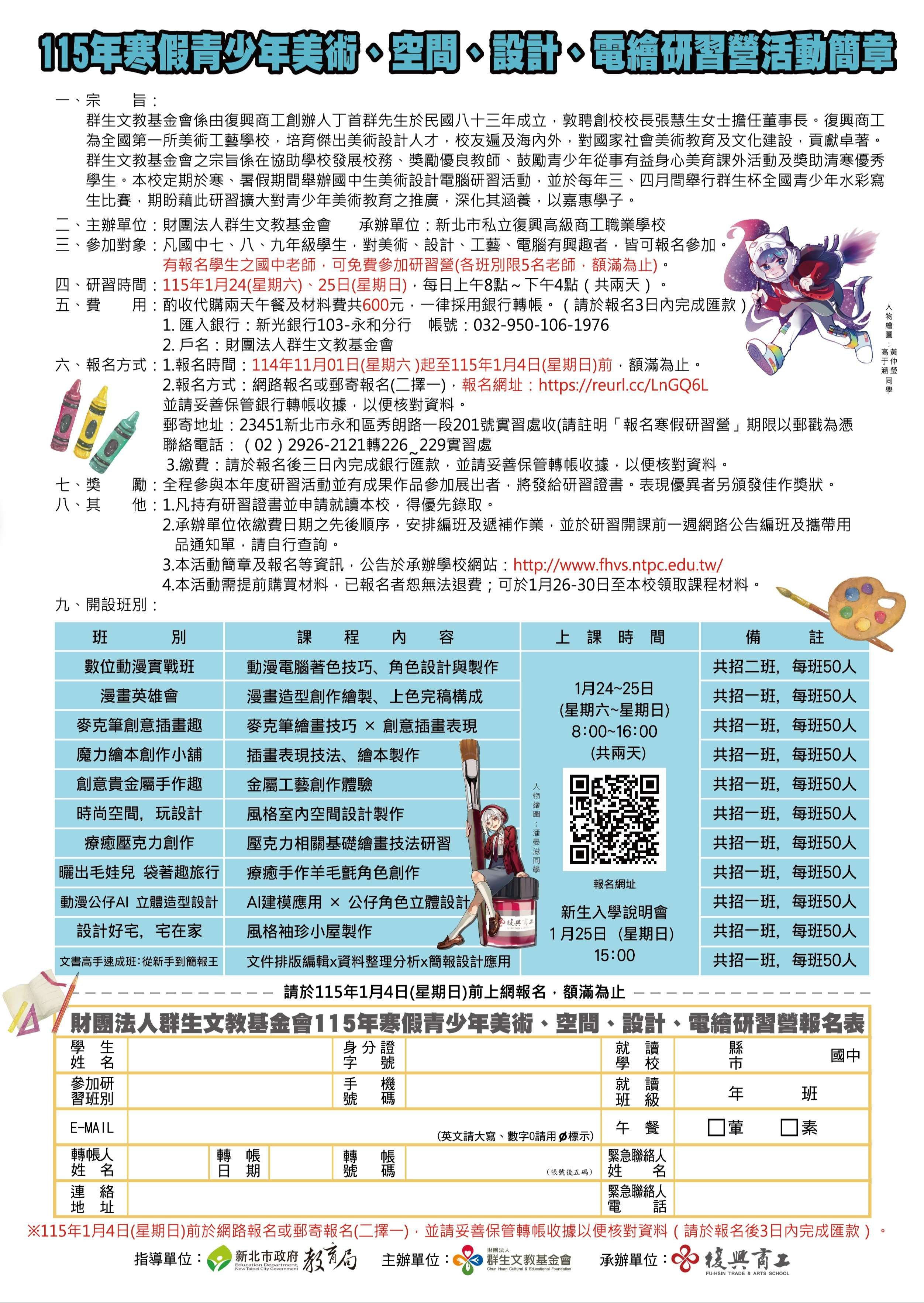 主旨:檢送本校承辦財團法人群生文教基金會「115年寒假青少 年美術、空間、設計、電繪研習營」活動簡章,敬請 惠予宣導,鼓勵學生踴躍參加。
