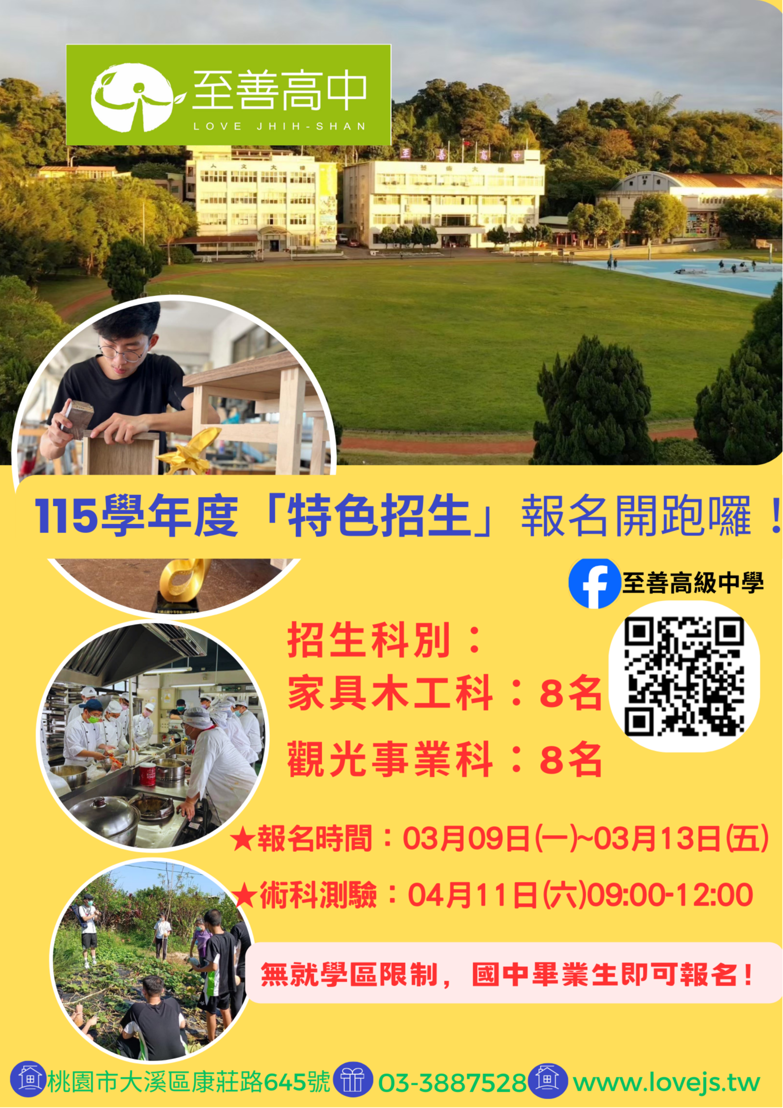 檢送 桃園大溪「至善高中」辦理115學年度「特色招生」 專業群科甄選入學,歡迎各縣市學生報考,請惠予公告, 請 查照。