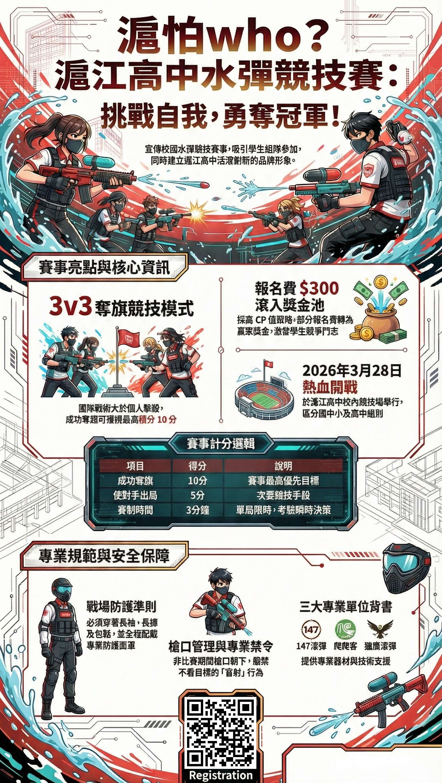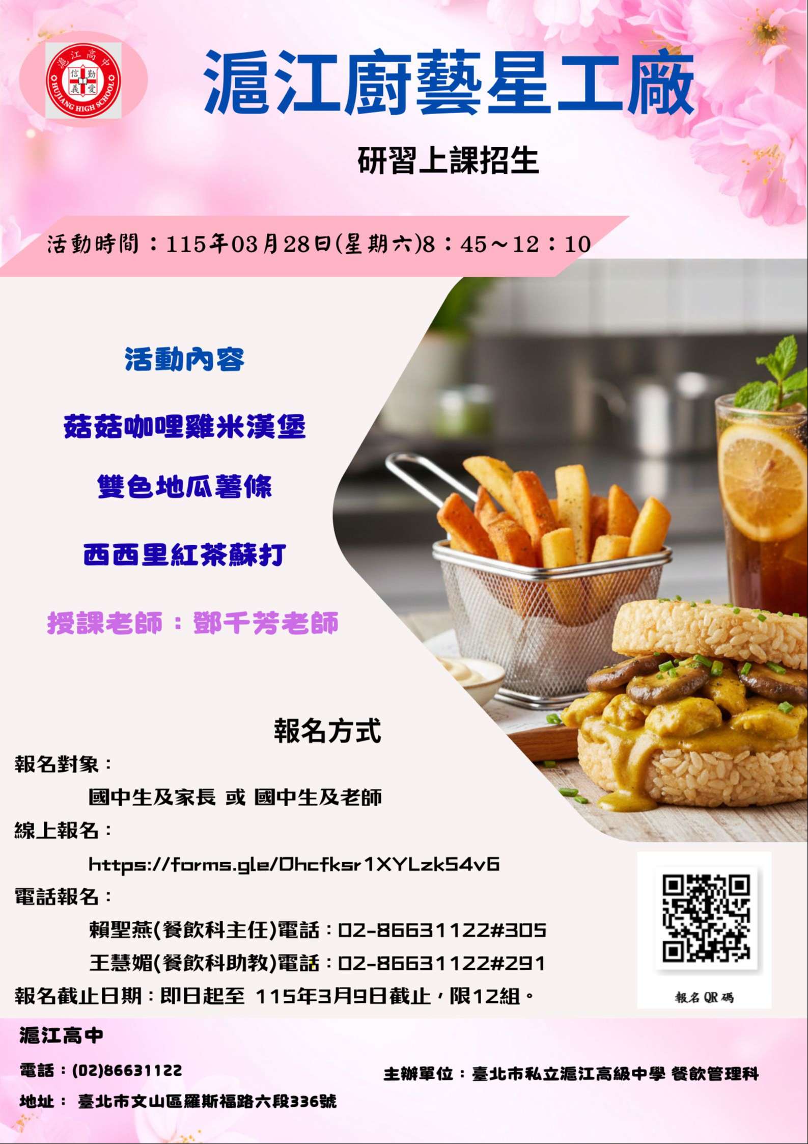 二、 活動當 日適逢本校櫻花祭,校園內備有多項精彩活動,誠邀 貴校 親師生共同參與:【專業體驗】 包含室內空間設計科電繪 課程、餐飲管理科「廚藝星工廠」實作。【熱血競技】 辦 理「滬怕WHO」水彈賽,提供安全刺激的動態對抗體驗。 【美感生活】 設置櫻花樹下二手市場尋寶區及野餐區,感 受浪漫校園氛圍。