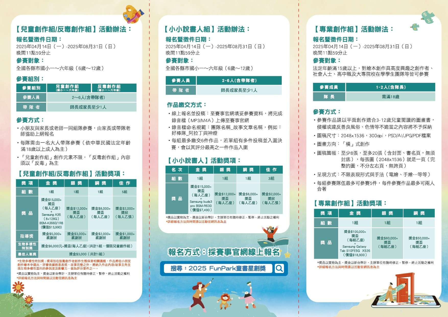 三、本賽事徵件期間自即日起至114年8月31日止,一律採網路 報名,報名網址:https://story.funpark.com.tw/。各組徵件對象及參賽資格說明如下: