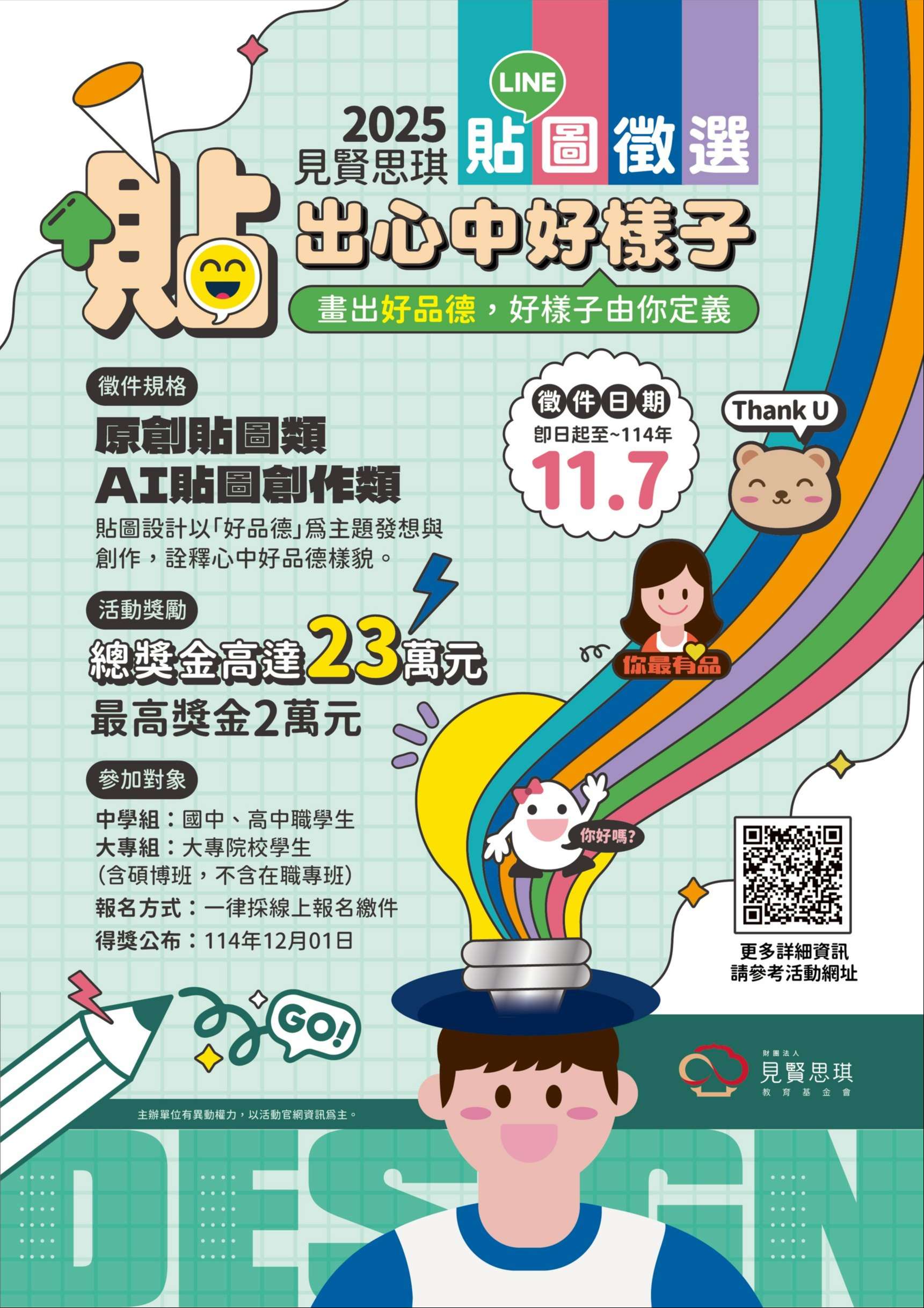 主旨:檢送本會辦理114年度「貼出心中好樣子」貼圖徵選活動簡章,敬請鼓勵學生踴躍參與,並協助公告活動訊息。