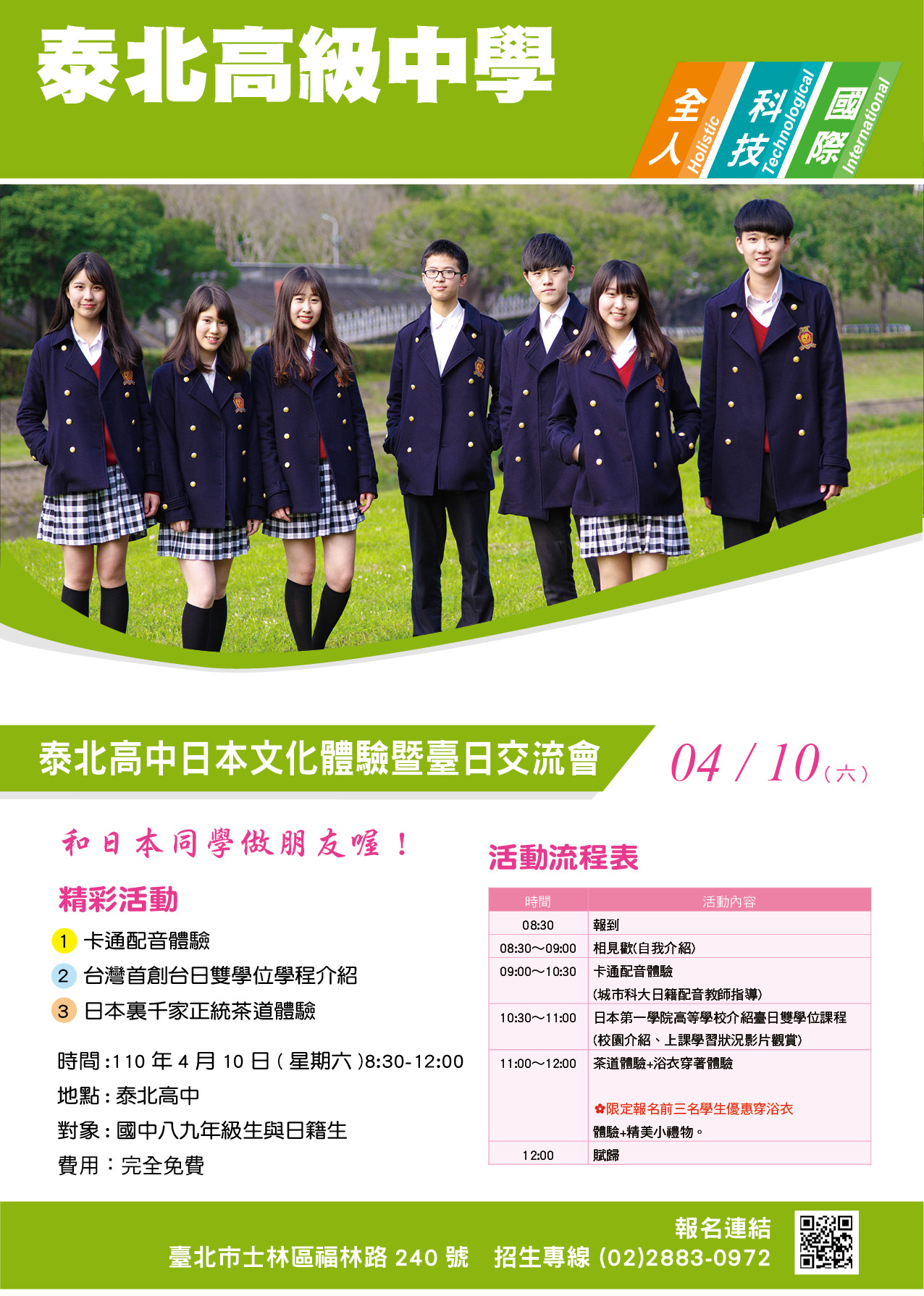 二、旨揭營隊分為應用日語科-日本文化體驗暨臺日交流會(110 年4月10日星期六)、設計群科-華山論藝-泰北設計大放藝彩設計群科成果特展暨精采體驗課程(110年4月13日至18日 星期二~日)、表演藝術科-華山1914文創園區烏梅劇院-表演藝術科科展暨第二屆畢業展「藝起玩」 (110年4月24日 至25日星期六至日),學生可針對自身興趣至附件的網址或掃描QR Code進行報名。