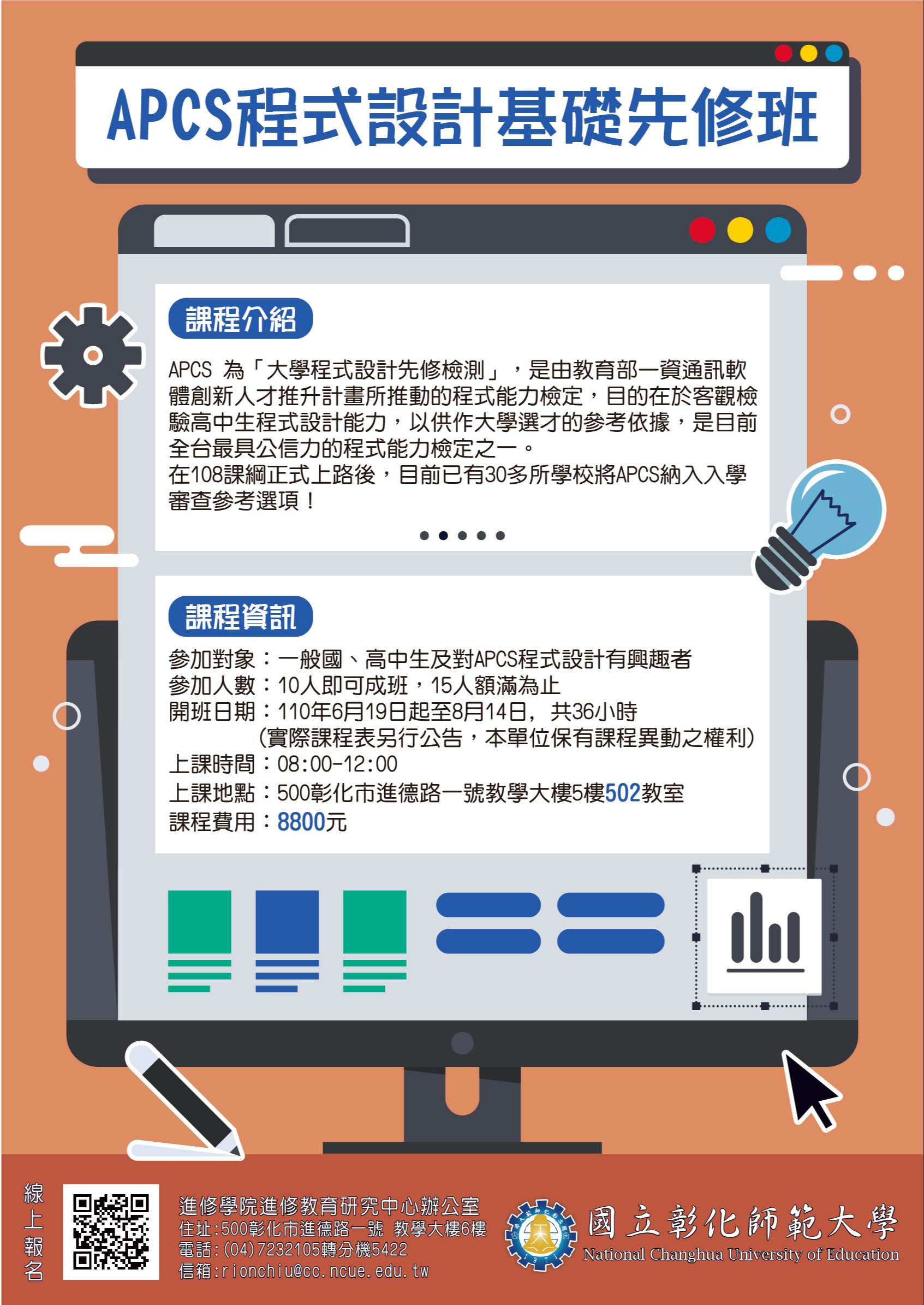 一、「APCS程式設計基礎先修班」課程時間為110年6月19日~8 月14日(每週六)8:00-12:00,合計36小時,課程費用每人 8,800元,即日起受理報名至110年6月4日(星期五)或額滿 為止,如有課程相關問題,請逕向課程承辦人 洽詢:04- 7232105轉分機5422 邱小姐。