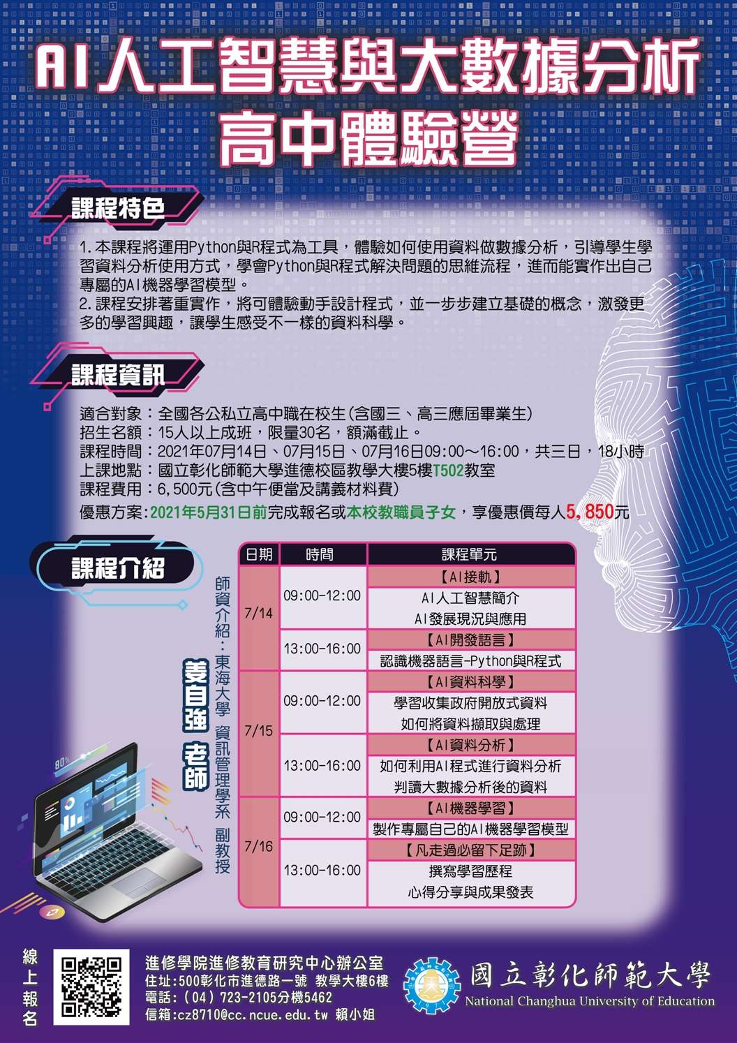 二、「AI人工智慧與大數據分析高中體驗營」課程時間為110年 7月14~16日9:00-16:00,共3日,合計18小時,課程費用每 人5,850元(含中午便當及講義材料費),即日起受理報名至 110年6月27日(星期日)為止,如有課程相關問題,請逕向 課程承辦人洽詢:04-7232105轉分機5462 賴小姐。