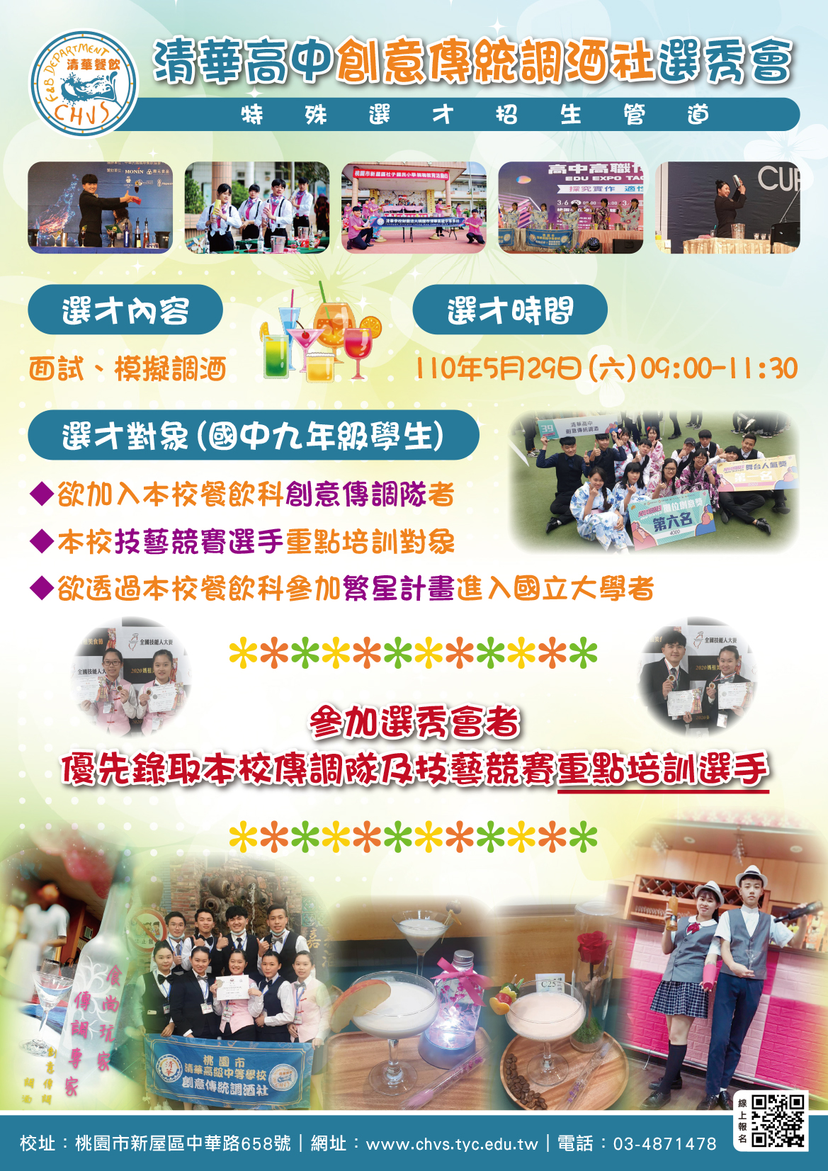二、檢送本校「餐飲科創意傳統調酒社選秀會文宣(如附件)」,請貴校協助公告並鼓勵國中九年級學生踴躍報 名。