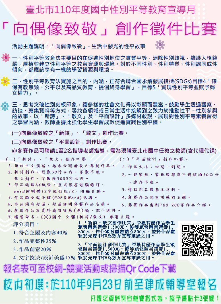 比賽項目分為:1.新詩、散文創作比賽。2.平面設計創作比賽。 校內收件時間:110年9月23日至本校輔導室報名。 詳細比賽說明與報名表可參考附件,請有意參與同學踴躍報名並及早準備。