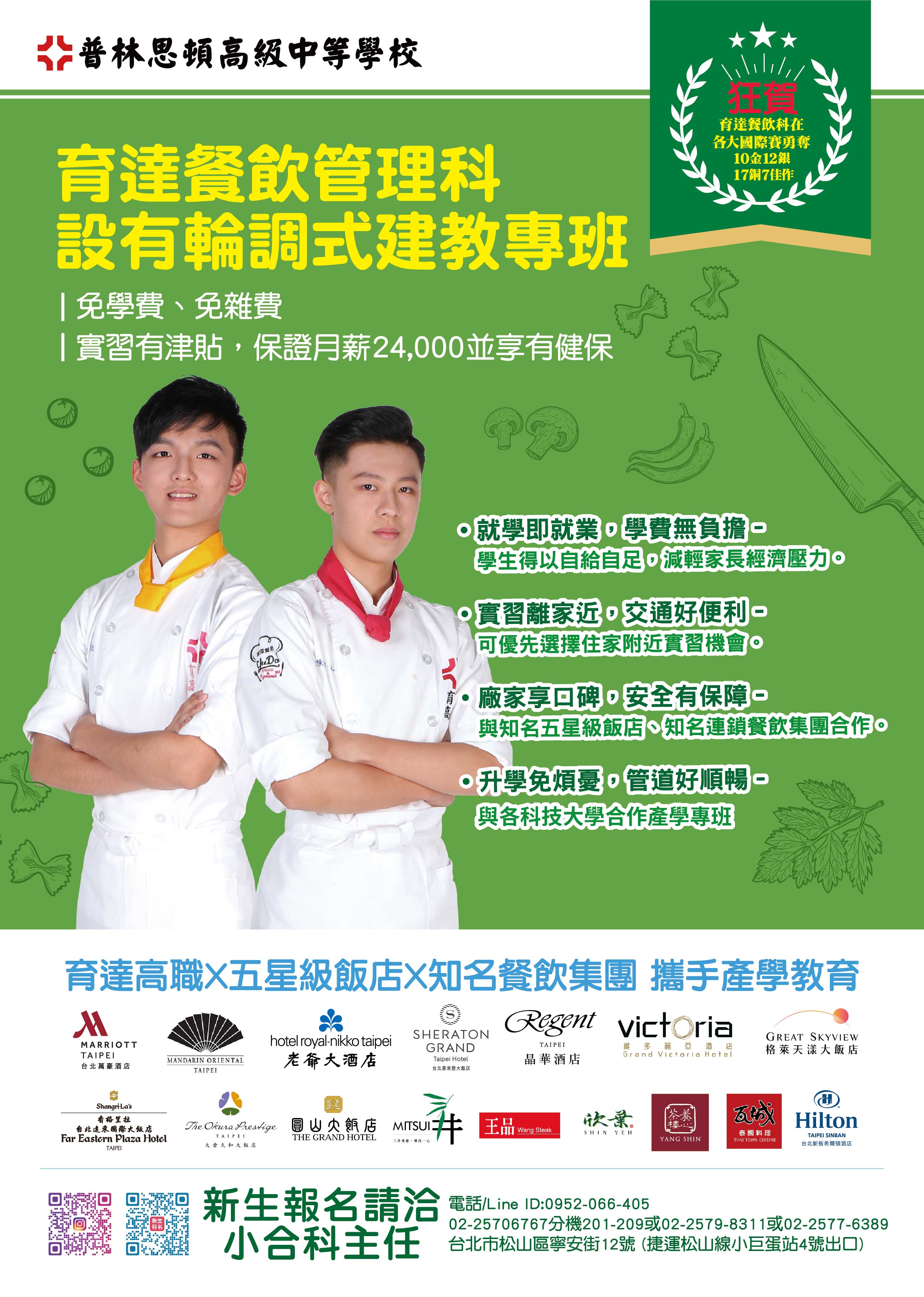 一、本校餐飲管理科與五星大飯店(晶華酒店、台北喜來登大飯 店、台北君悅大酒店..)與知名連鎖產業(王品集團、欣葉國際餐飲集團、瓦城泰統集團..)合作,品牌大有保障。