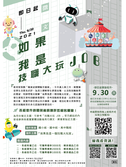 四、為能深入瞭解學生參觀展覽或體驗課程後的收穫,教育部舉辦「如果我是一個技職大玩家」徵文競賽,有意願參加者請於110年9月30日前投稿至Google表單者 (https://reurl.cc/ZGErYW),將有機會獲得1000元至 3000元不等的禮券及精美禮品1份。競賽報名詳情,請參閱 「技職大玩JOB」網站或「技職動起來」臉書粉絲頁。