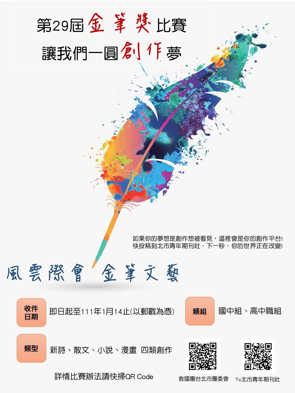 一、金筆獎創作比賽歷經29年的耕耘,茲為倡導青年學生寫作 風尚,提供校園文藝創作平台,鼓勵青年朋友勇於恢弘寫 作、繪畫才華,提升全民生活美學、涵養,希請共同推 廣,增進校園文學氣息。