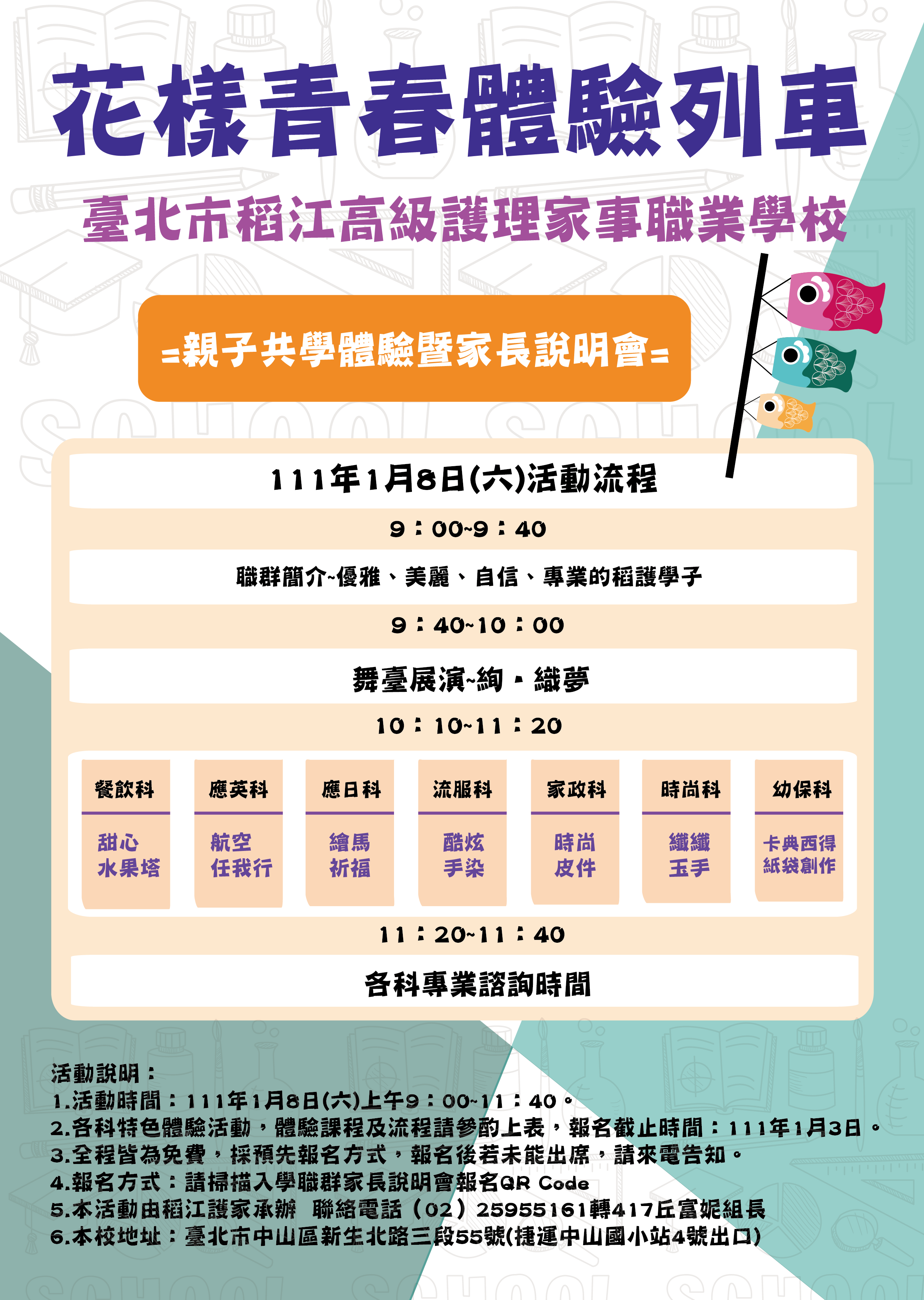 二、本學期於111年01月08日(星期六)舉辦「稻江護家花漾親子共學體驗」,誠摯邀請八、九年級學生參加,並歡迎教師或學生家長共同參與。