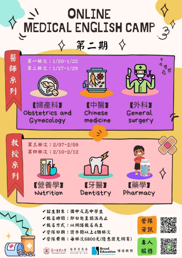一、本校結合專業醫療師資、語言中心、國際師資及國際學生 的資源,創造全英語的環境,讓學童們能藉由營隊期間的各種課程與活動啟發對於醫學領域的興趣,延展對職涯探索的新領域。營隊將於111年1月20日至111年2月12日期間辦理「寒假線上英文醫學營」,總共預定辦理四個梯次, 分別為第1梯1/20-1/22、第2梯1/27-1/29、第3梯2/7-2 /9、第4梯2/10-2/12,惠請貴單位協助轉發,並歡迎共襄盛舉。