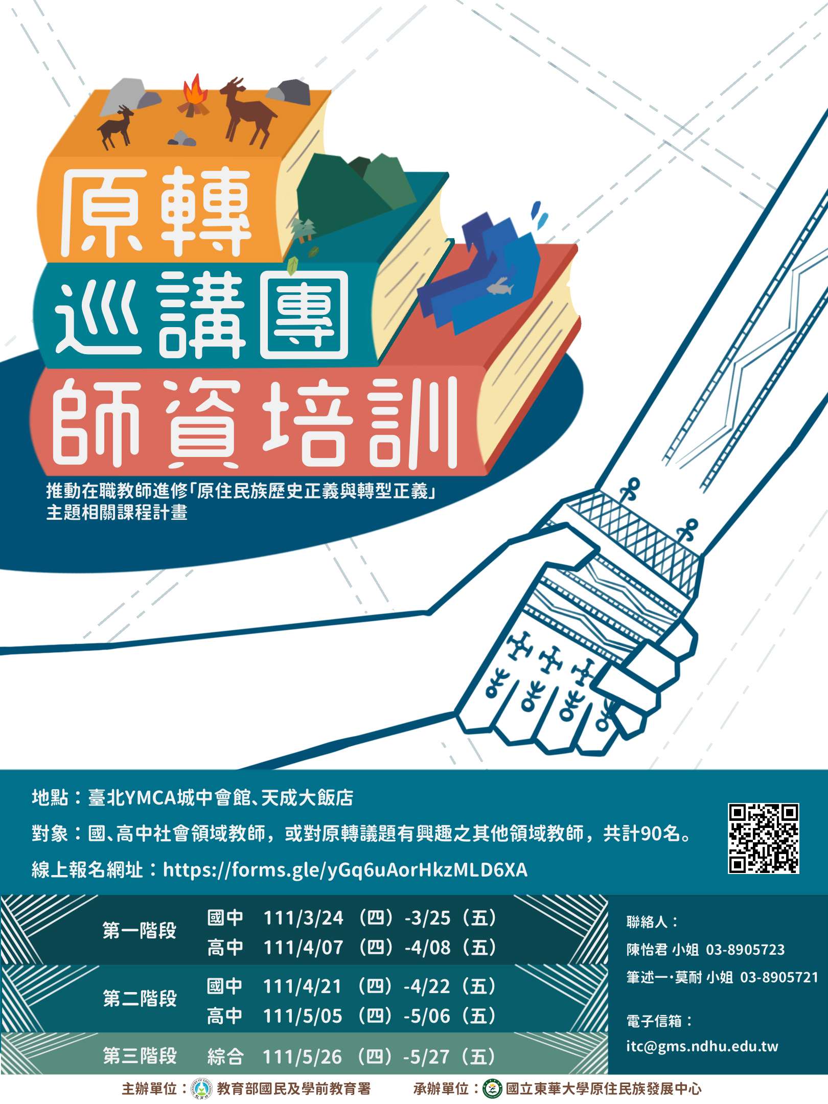 (三)培訓對象:國、高中社會領域教師,或對原轉議題有興 趣之其他領域教師,共計90名。完整參加三階段課程及 各階段所交付作業,即授予培訓證書與成為原轉巡講團 師資。