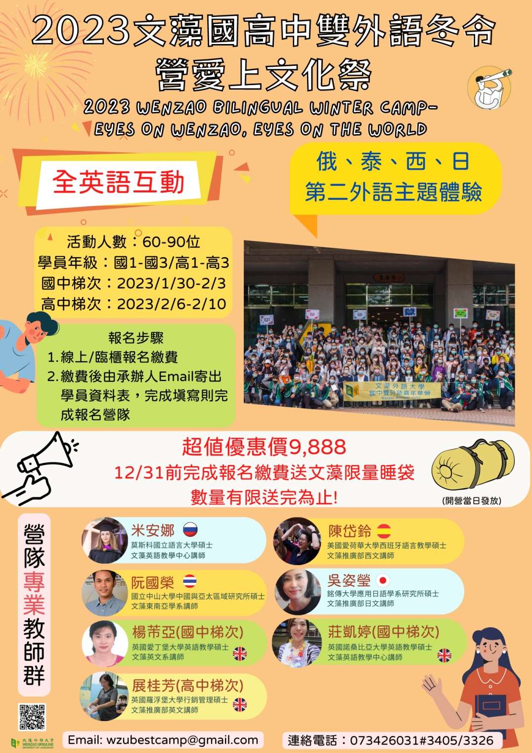 三、活動對象:國中學生(採全英語教學與活動進行,報名時請檢附111學年度成績單英文70分以上或全民英檢初級初試通過證明)。