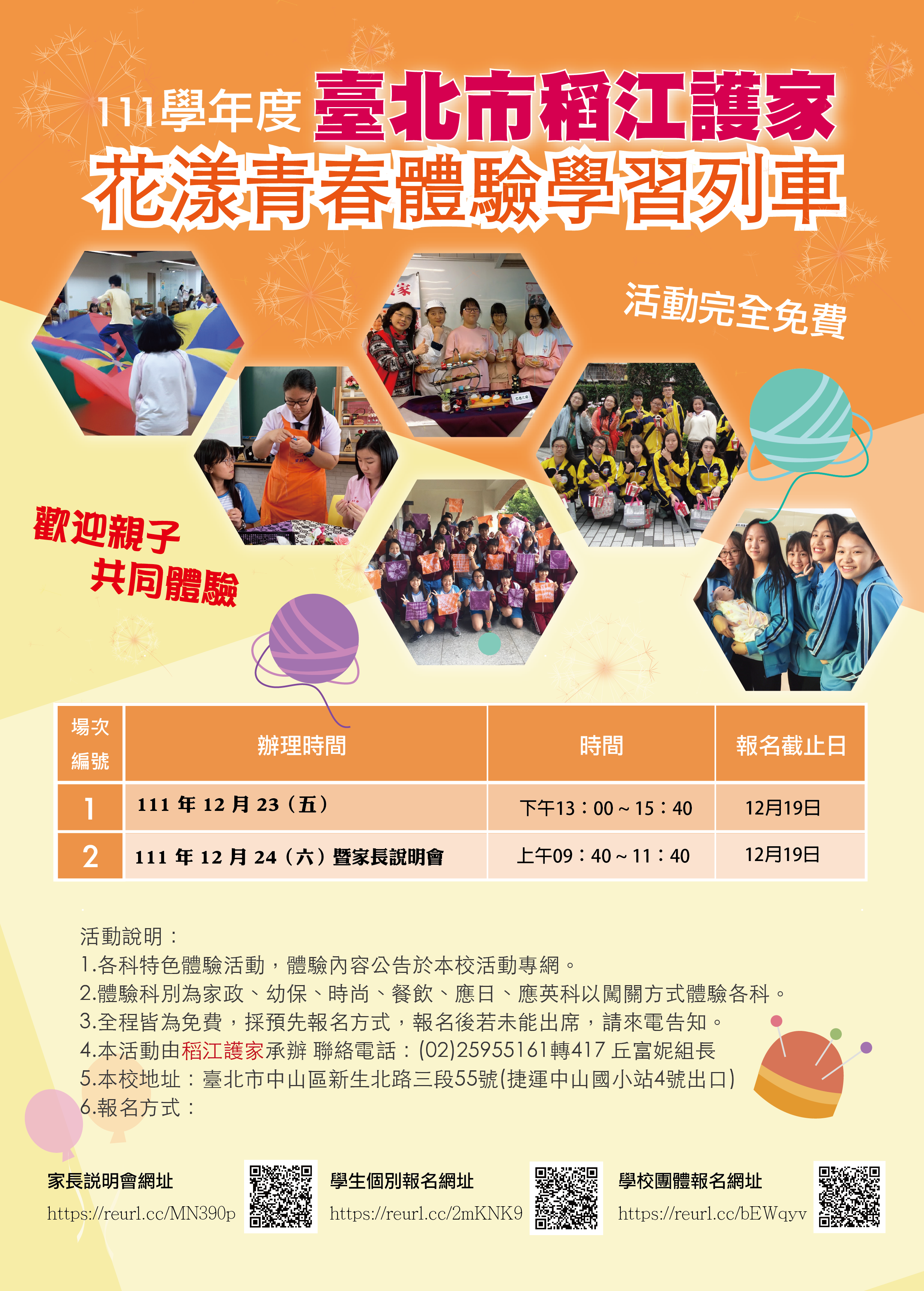 二、本學期於111年12月23日(五)、12月24日(六)辦理「稻江護 家花漾群科體驗活動」,誠摯邀請 貴校八、九年級學生參 加,並歡迎 貴校教師或學生家長共同參與。