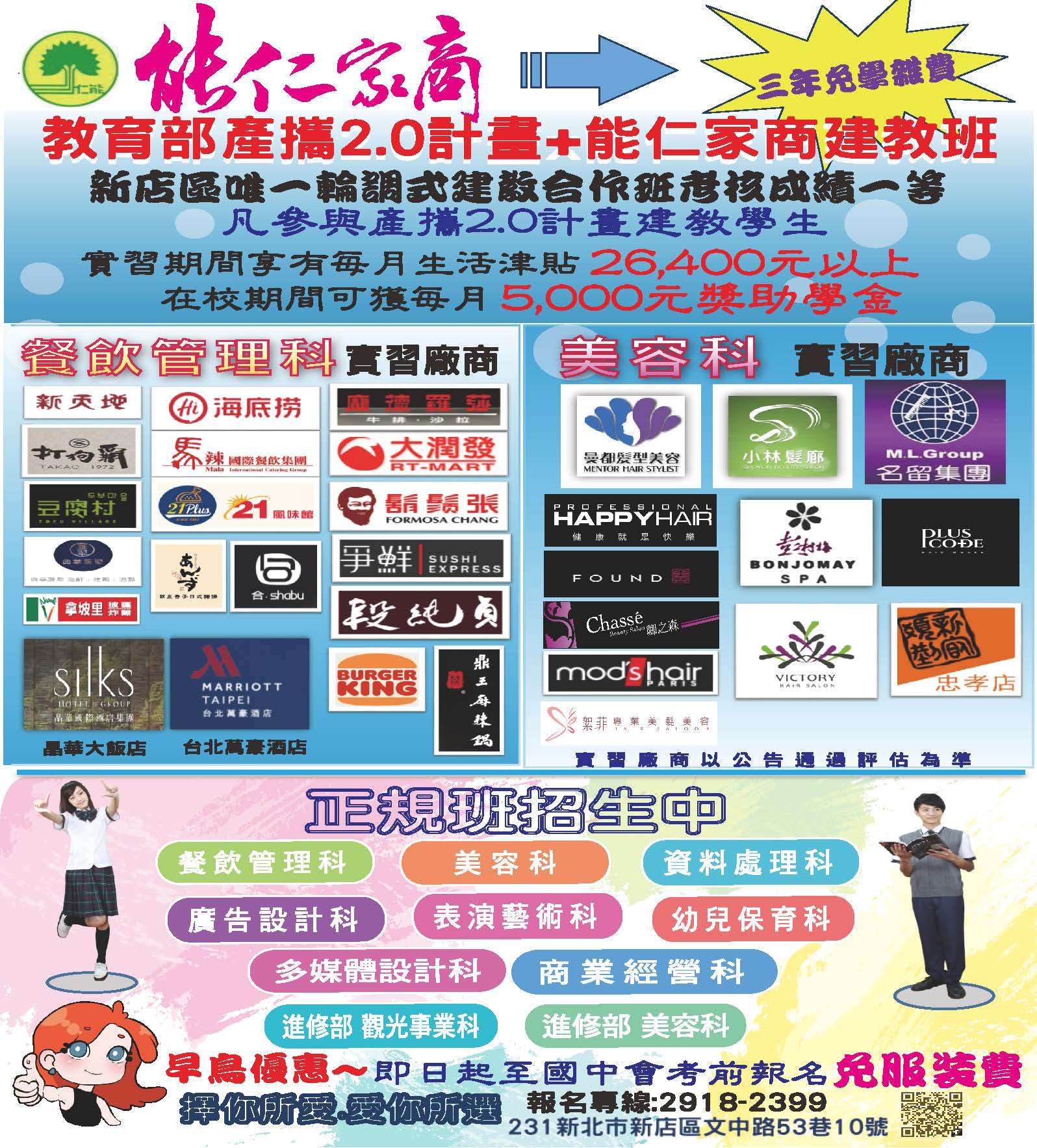 六、敬請 惠允公告周知並推薦具技職潛質且有意至建教合作機 構實習之應屆畢業學生就讀本校產學攜手建教合作專班, 若有相關宣導辦理疑義,請洽能仁家商實習處建教組(02- 29182399分機170、171)。