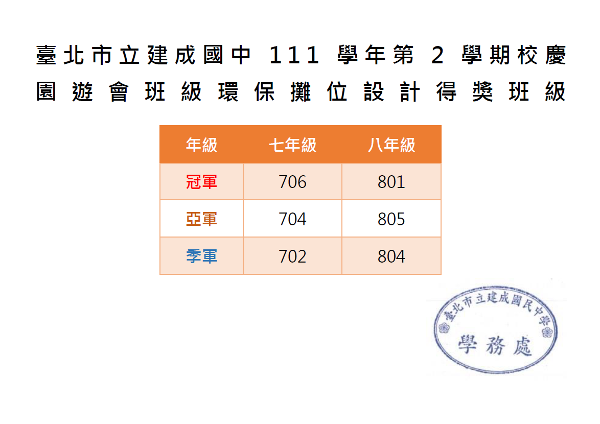 公告本校第55屆校慶 Infinality & Be Young 園遊會環保攤位設計得獎班級。