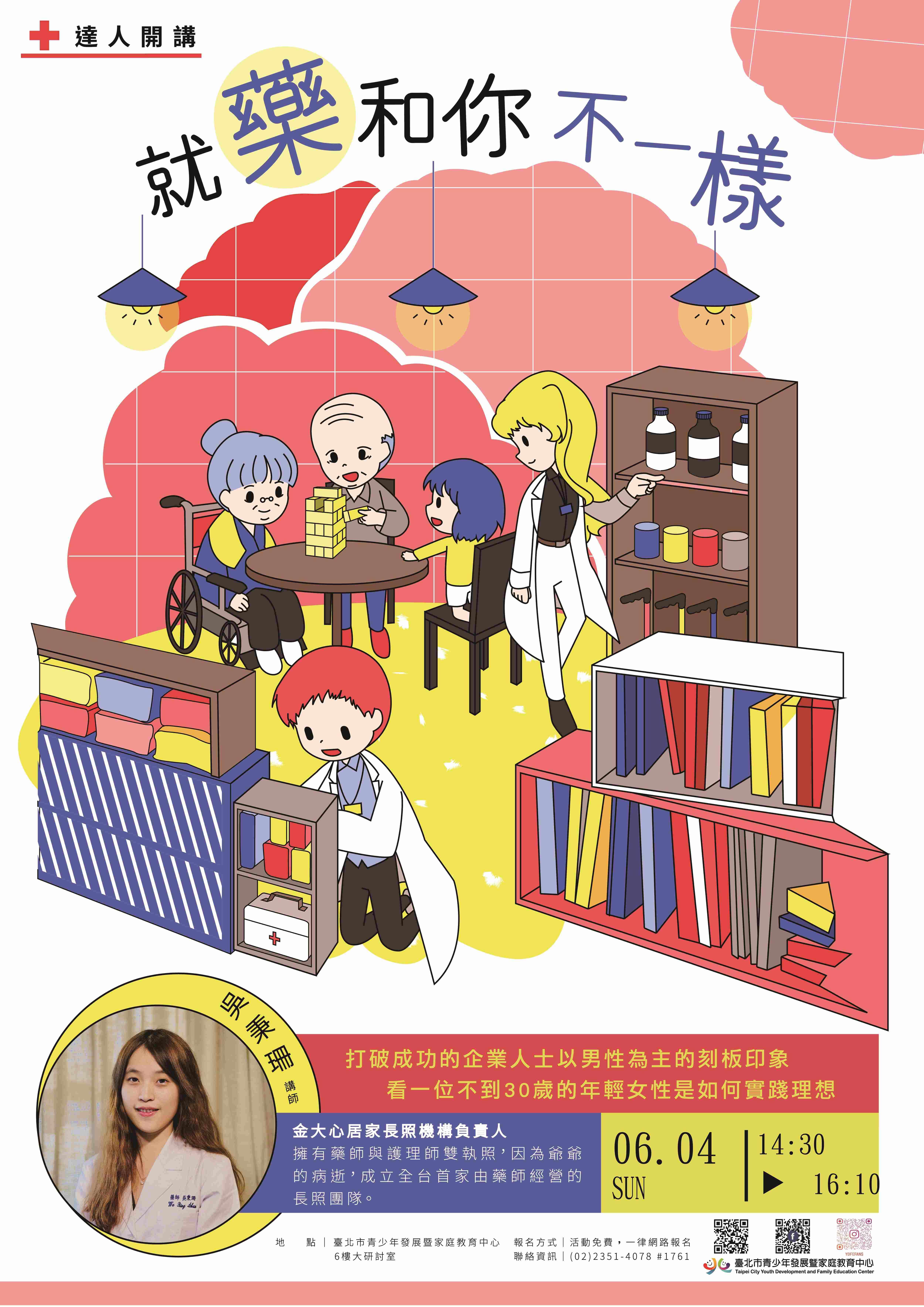 三、宣傳稿內容如下: (一)90字:臺北市青少年發展暨家庭教育中心6月4日14:30舉 辦達人開講「就藥和你不一樣」,金大心居家長照機構 負責人吳秉珊老師與您分享她經營長照團隊的心路歷 程,以及過程中的體驗。活動免費,詳見青發家教中心 官網。 (二)60字:臺北市青少年發展暨家庭教育中心6月4日14:30舉 辦達人開講:就藥和你不一樣。吳秉珊與您分享她經營 長照團隊的心路歷程;活動免費詳見青發家教中心官 網。 (三)30字:青發家教中心6/4吳秉珊開講:就藥和你不一樣。 活動免費詳官網。
