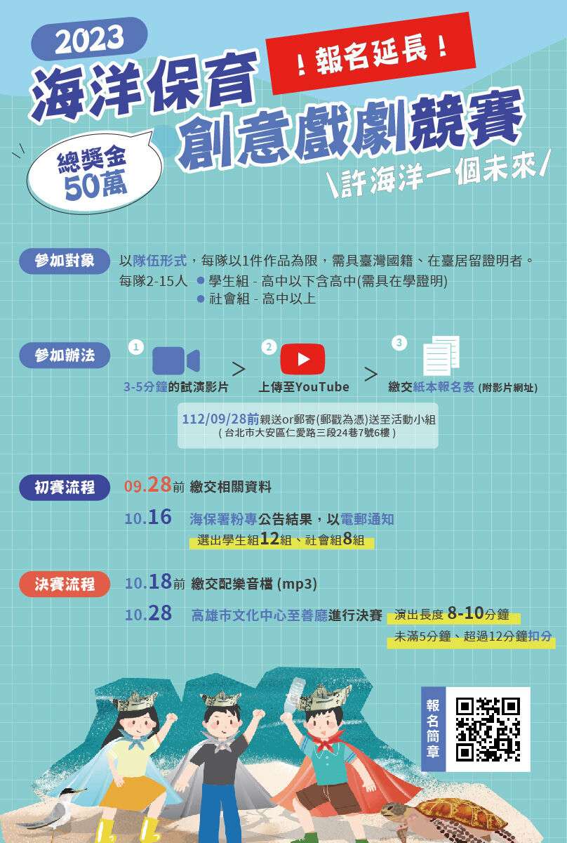 二、為擴大推廣海洋保育教育,該署112年度舉辦旨揭競賽活動,並邀請教育部、文化部及農業部擔任指導單位,期望 透過不同領域國人共襄盛舉,發揮創意思維,以多元形式 演繹如何「許海洋一個未來」,歡迎組隊報名參加競賽。 三、旨揭活動重要資訊如下