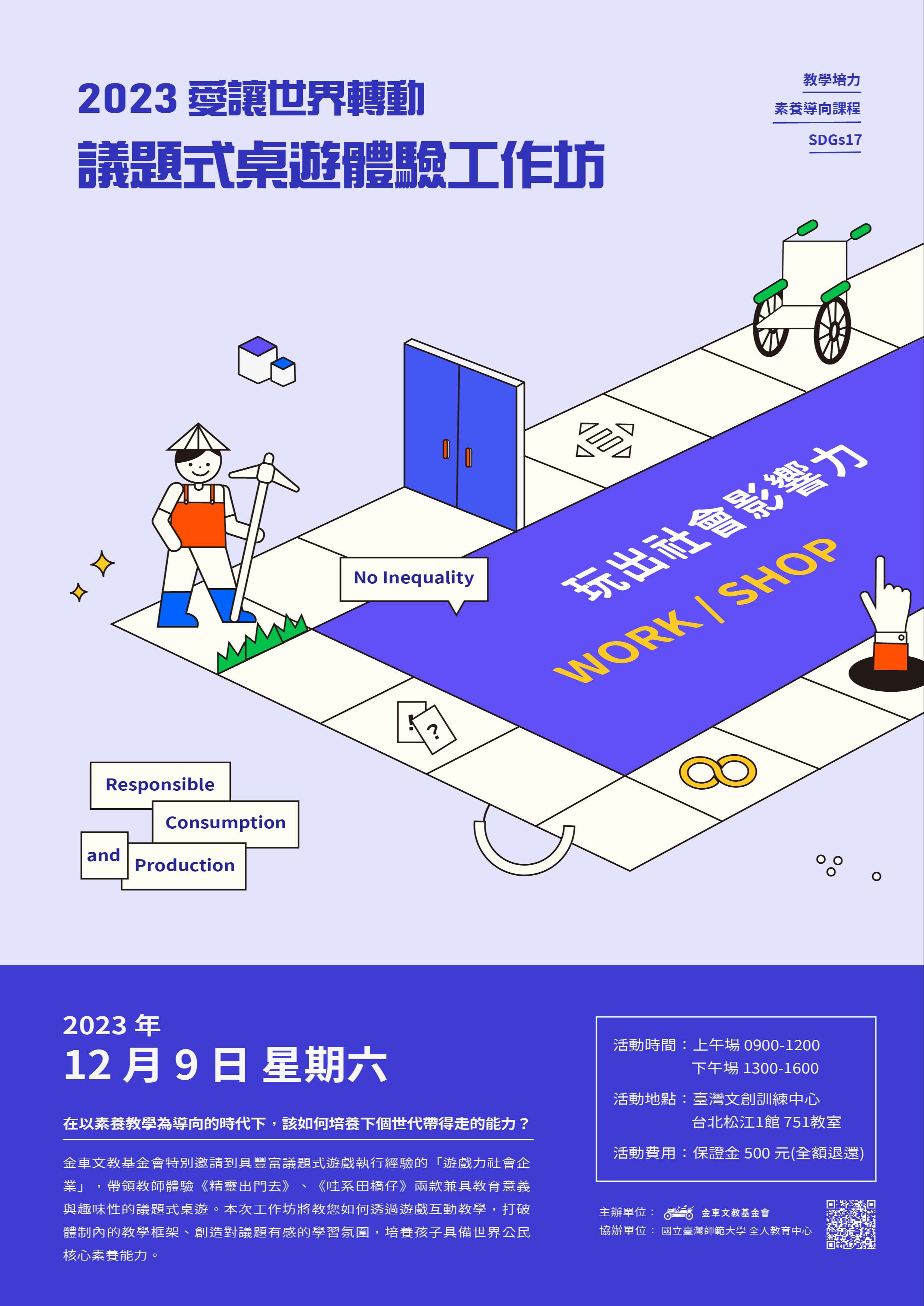 一、金車文教基金會長期深耕國際素養教育,定期辦理教師增 能課程,本次工作坊特別邀請到「遊戲力社會企業」,從 SDG10-消弭國家不平等和SDG12-永續生產與消費主題出 發,帶領教師體驗《精靈出門去》、《哇係田橋仔》兩款 兼具教育意義與趣味性的議題式桌遊。課程中將分享如何 透過遊戲導向式教學,跳脫傳統教學框架,創造對議題有 感的學習氛圍,培養孩子具備「問題解決」、「團隊合 作」、「行動實踐」的世界公民核心素養能力。