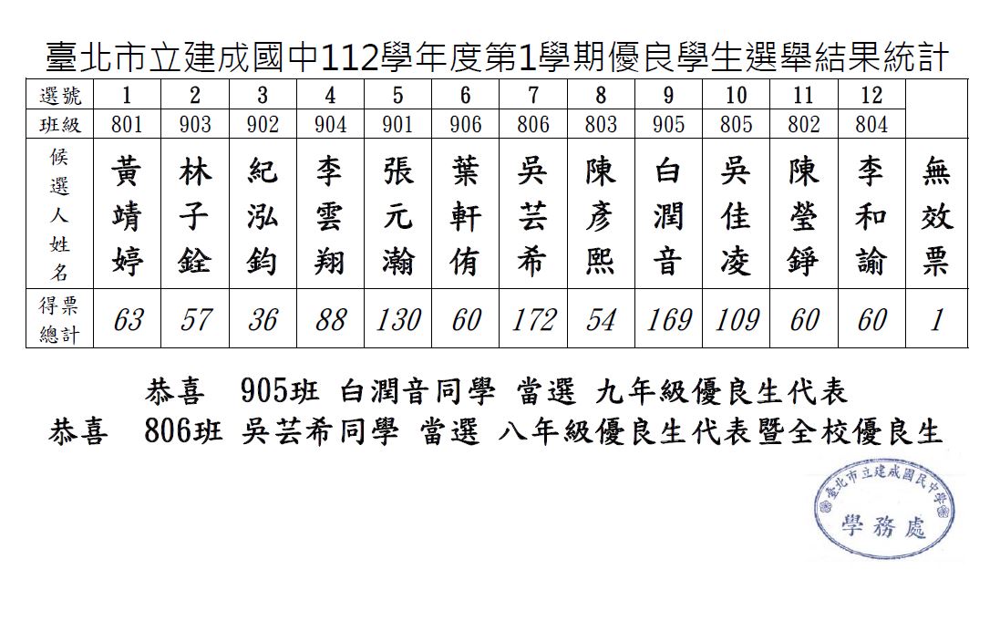 公告本校112學年優良生選舉結果: 恭喜905班白潤音同學 當選本校9年級優良生代表 恭喜806班吳芸希同學 當選本校8年級優良生代表暨全校優良生票選第1名