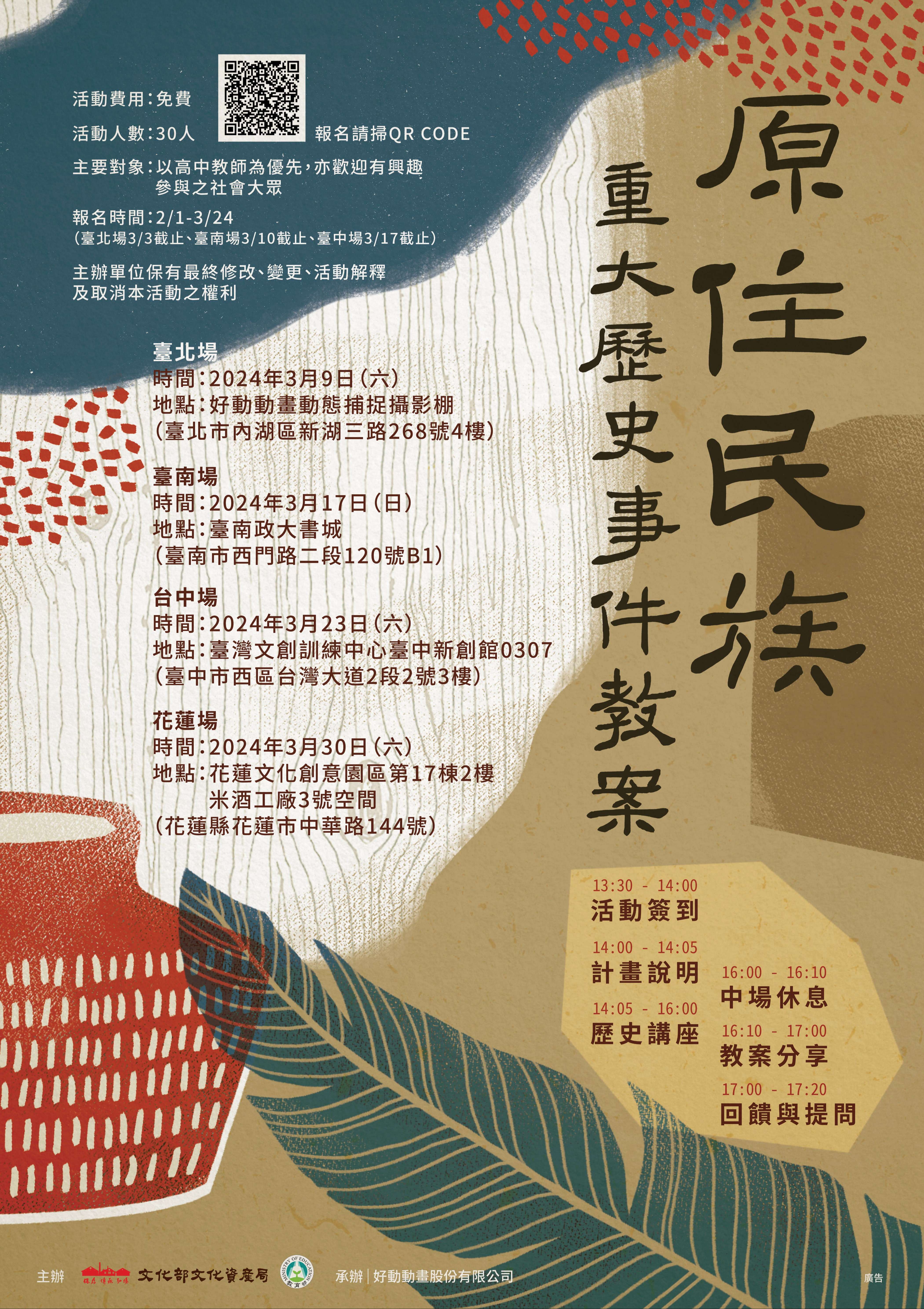 二、為使社會大眾更容易且廣泛認識原住民族歷史,文化部文化資產局與教育部攜手,從原住民族觀點出發,共製原住民族重大歷史事件3D動畫,並開發教案,希冀提供學校教師更多教學素材,將於113年3月份辦理4場次教案工作坊,邀請歷史學者講述重大歷史事件對原住民族的影響,同步分享動畫教案的成果。