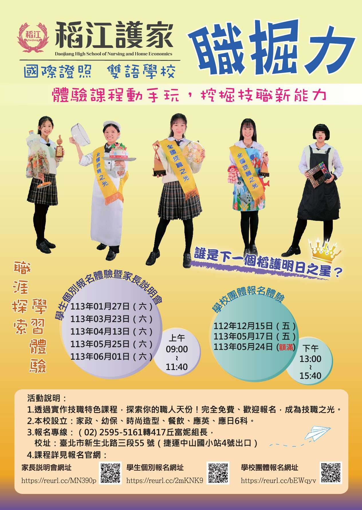 本校辦理技職高中體驗學習參觀活動-「稻江護家職掘力 實作體驗」,敬請轉知 貴校八、九年級學生踴躍報名參 加並惠允公假。