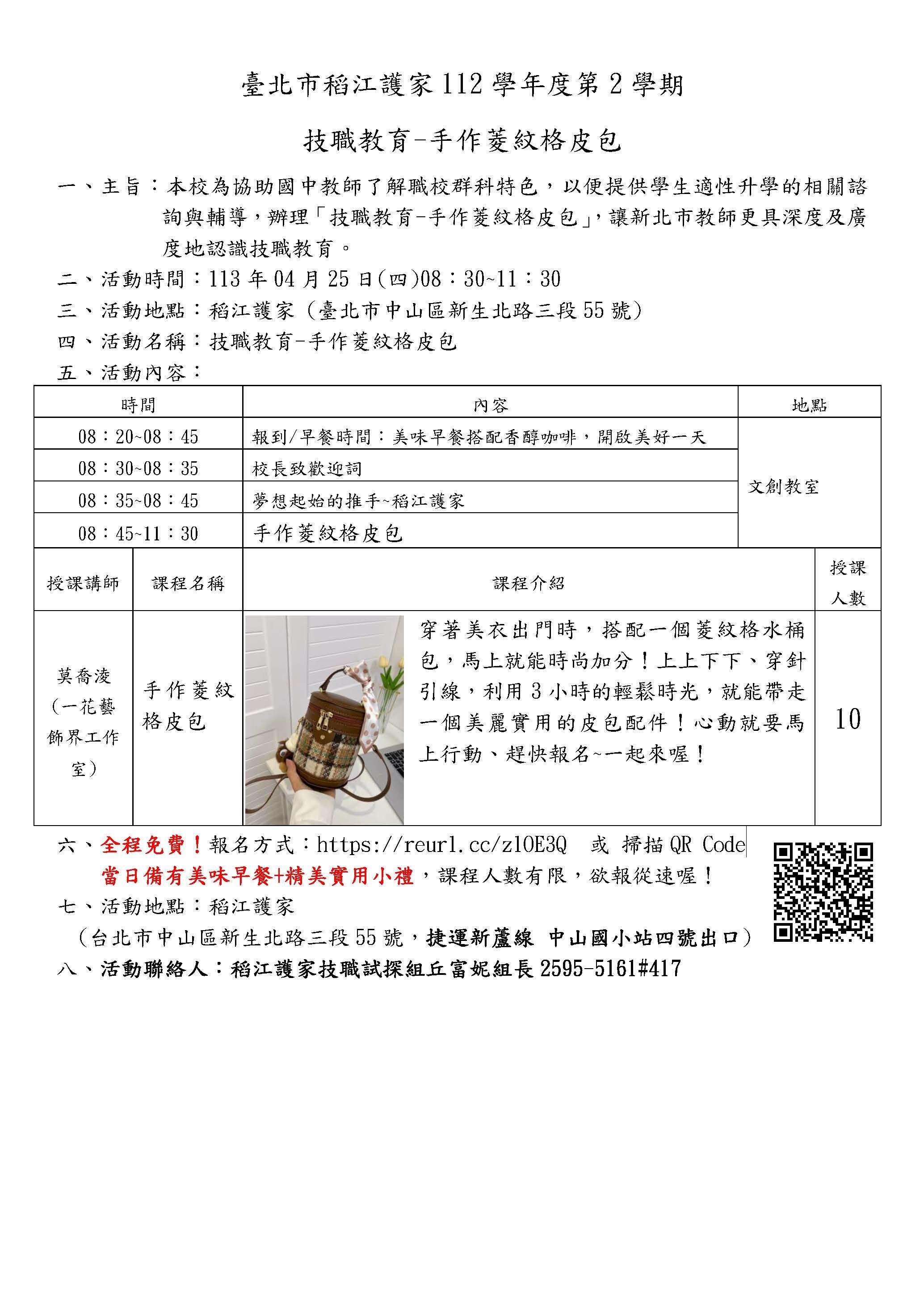 二、本校於113年4月25日(四)上午8:30-11:30,辦理「技職 教育-手作菱紋格皮包」。誠摯邀請 貴校教師及輔導學生 升學相關行政人員踴躍報名參加,全程免費。