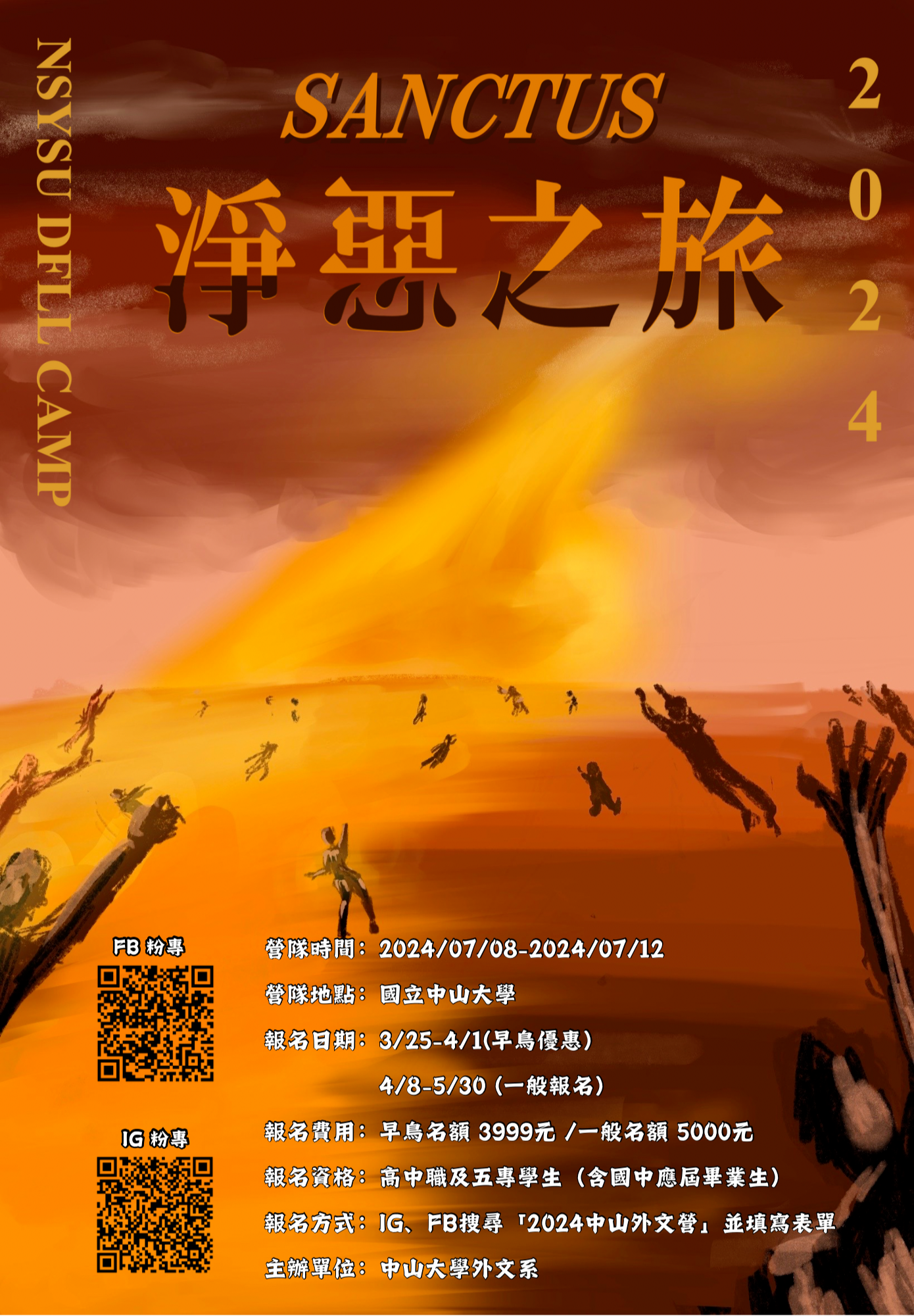 (六)FB粉絲專頁(2024中山外文營):https://www.facebook.com/profile.php?id=61556837051726;IG專頁(Sanctus.2024)https://www.instagram.com/sanctus.2024igsh=dGdlenRmcnM5OXZ2