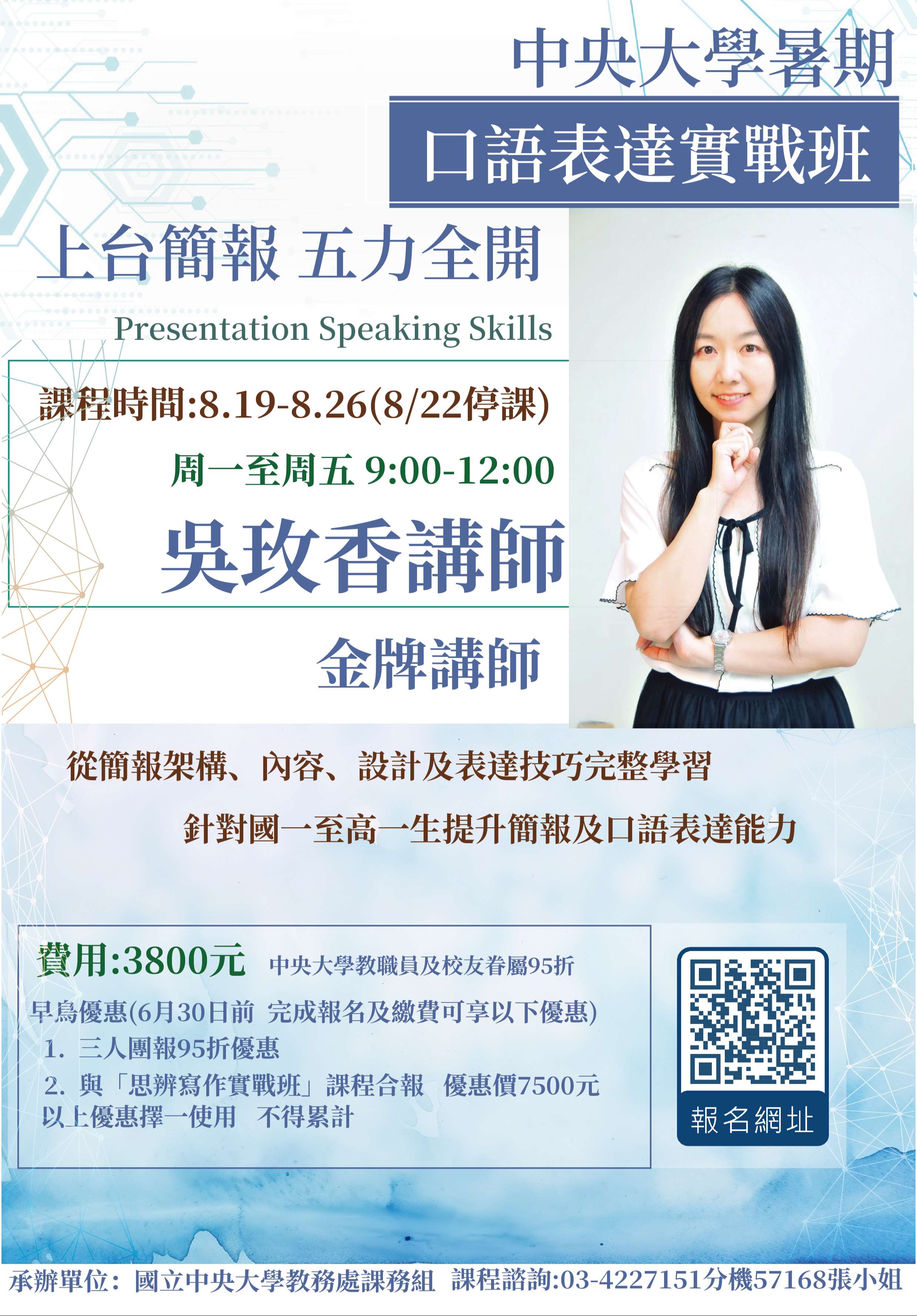 (一)上午9時至12時,「口語表達實戰班-上台簡報五力全開」。招生對象:國中生至高一生。