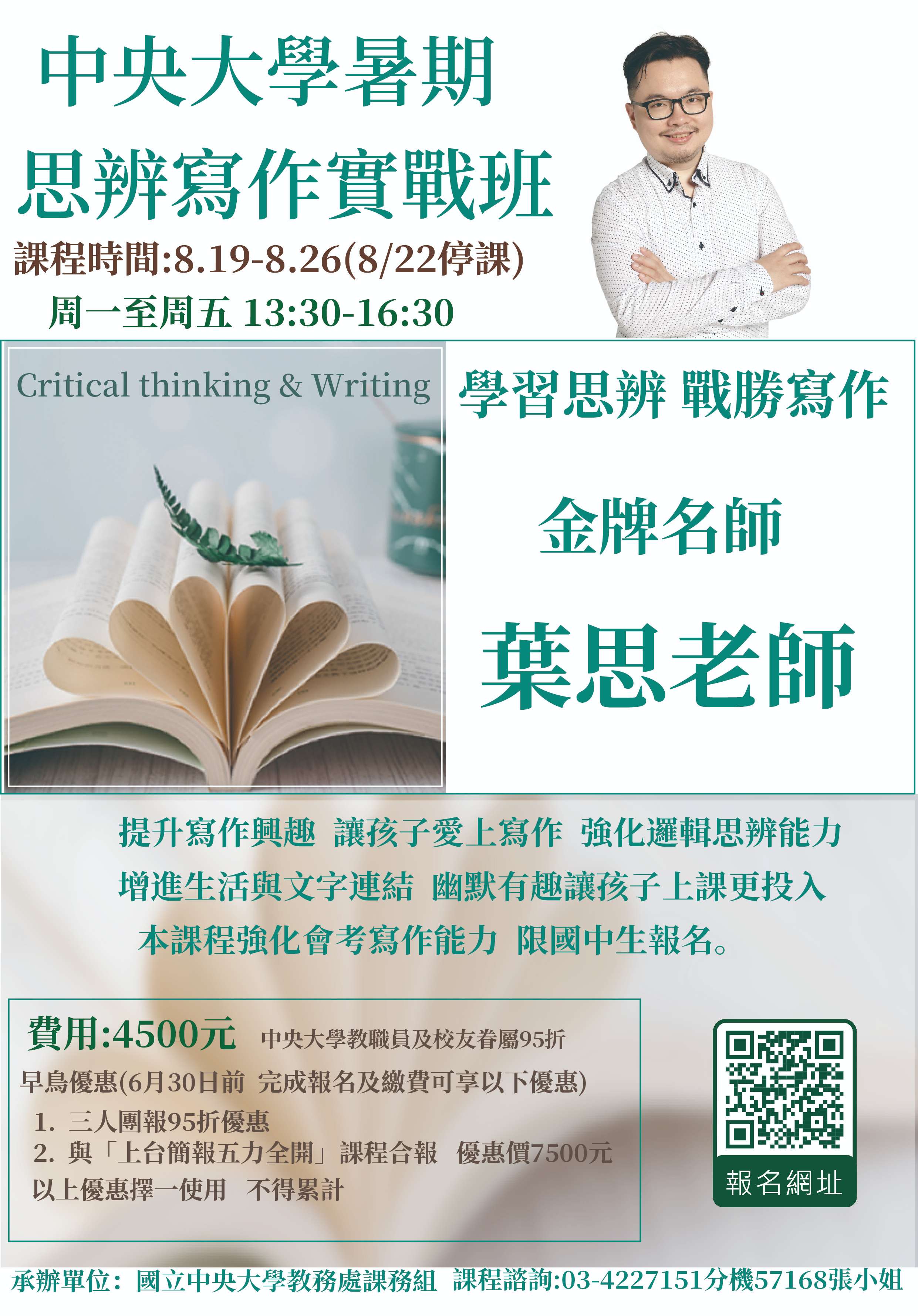 一、為提升孩子競爭力,國立中央大學特聘專長領域師資,設計國中生至高一生由淺入深的「思辨寫作實戰班 、口語表達實戰班 」課程,以重視實作演練的工作 坊形式,訓練
