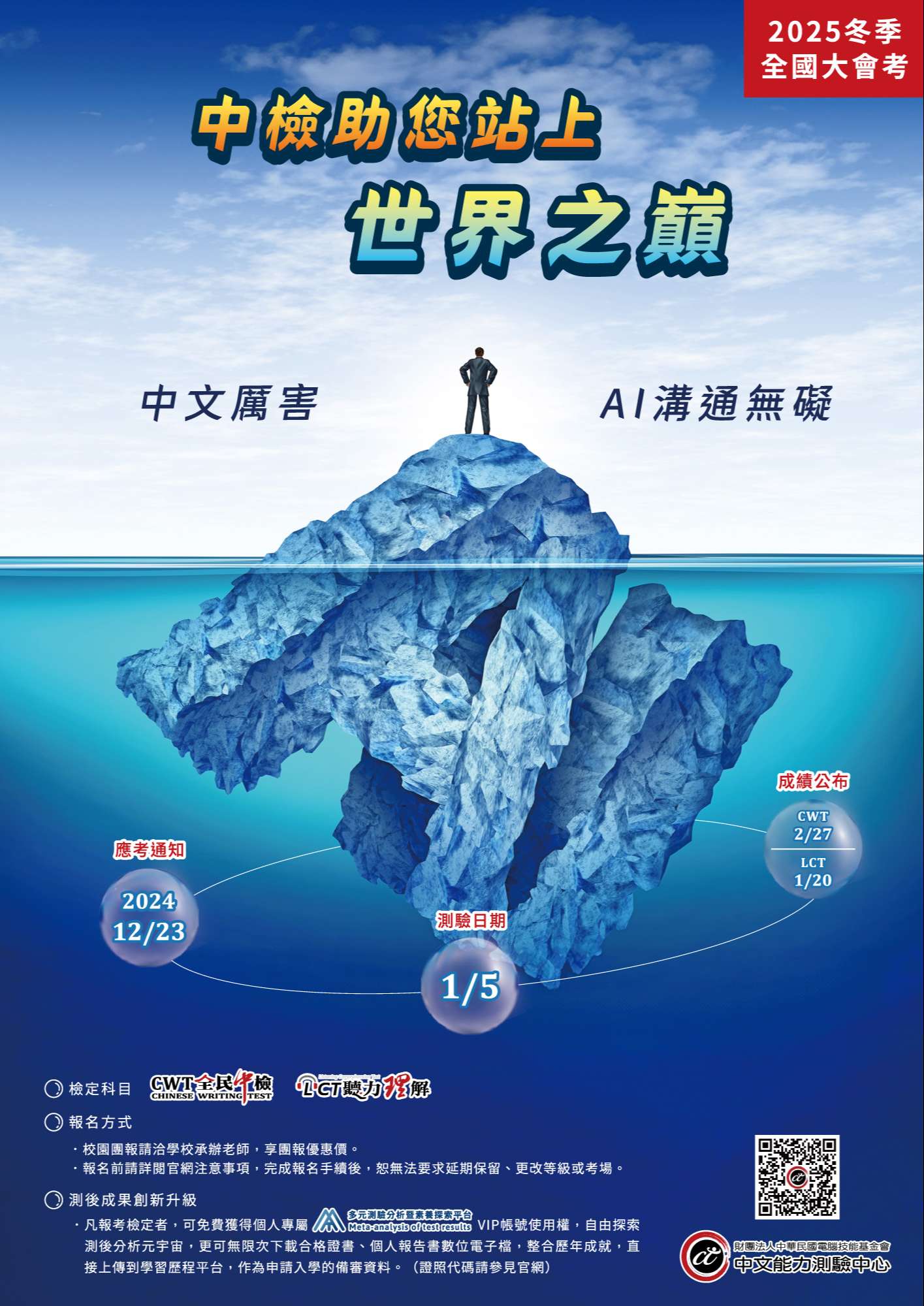 一、「CWT全民中檢」、「LCT中文聽力理解檢定」為全國唯一通過教育部民間推薦採認之中文類證照,亦於「全國高級中等學校學生學習歷程資料庫」認列為多元表現之證明,將有助貴校學生升學備審。證照代碼如下:甲、CWT全民中檢證照代號: 初等9110、中等8021、中高等7979、高等7863及優等7896 。乙、LCT中文聽解證照代號: 酷紅級9111、白金級9112、鈦金級9113及星鑽級9114。