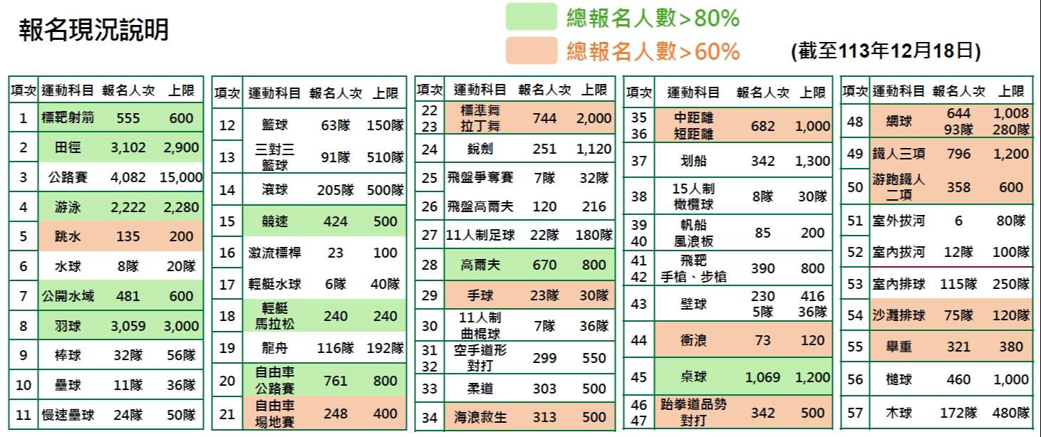二、上開運動會自113年2月13日開始報名,即將於114年2月17日截止報名,目前仍有多項運動種類尚有缺額(詳附件),請鼓勵所屬教職員工踴躍報名參加,報名系統網址:https://reg.wmg2025.tw/。