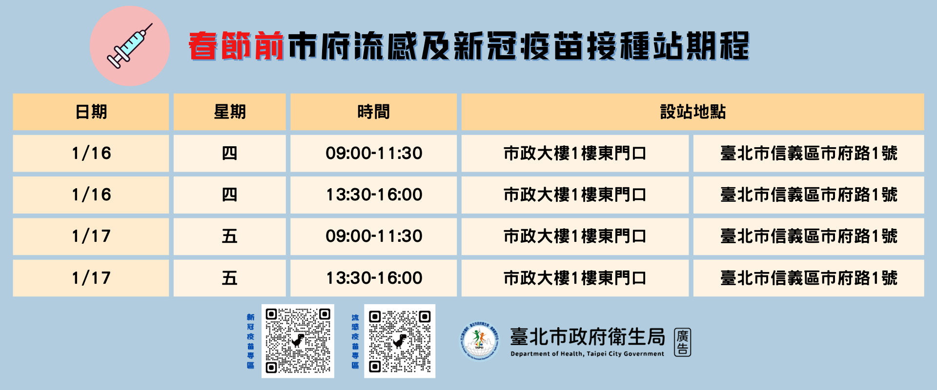 主旨:衛生局訂於114年1月16日至17日假本市市政大樓1樓東門醫務室旁辦理流感及新冠JN.1疫苗接種站,請踴躍接種。