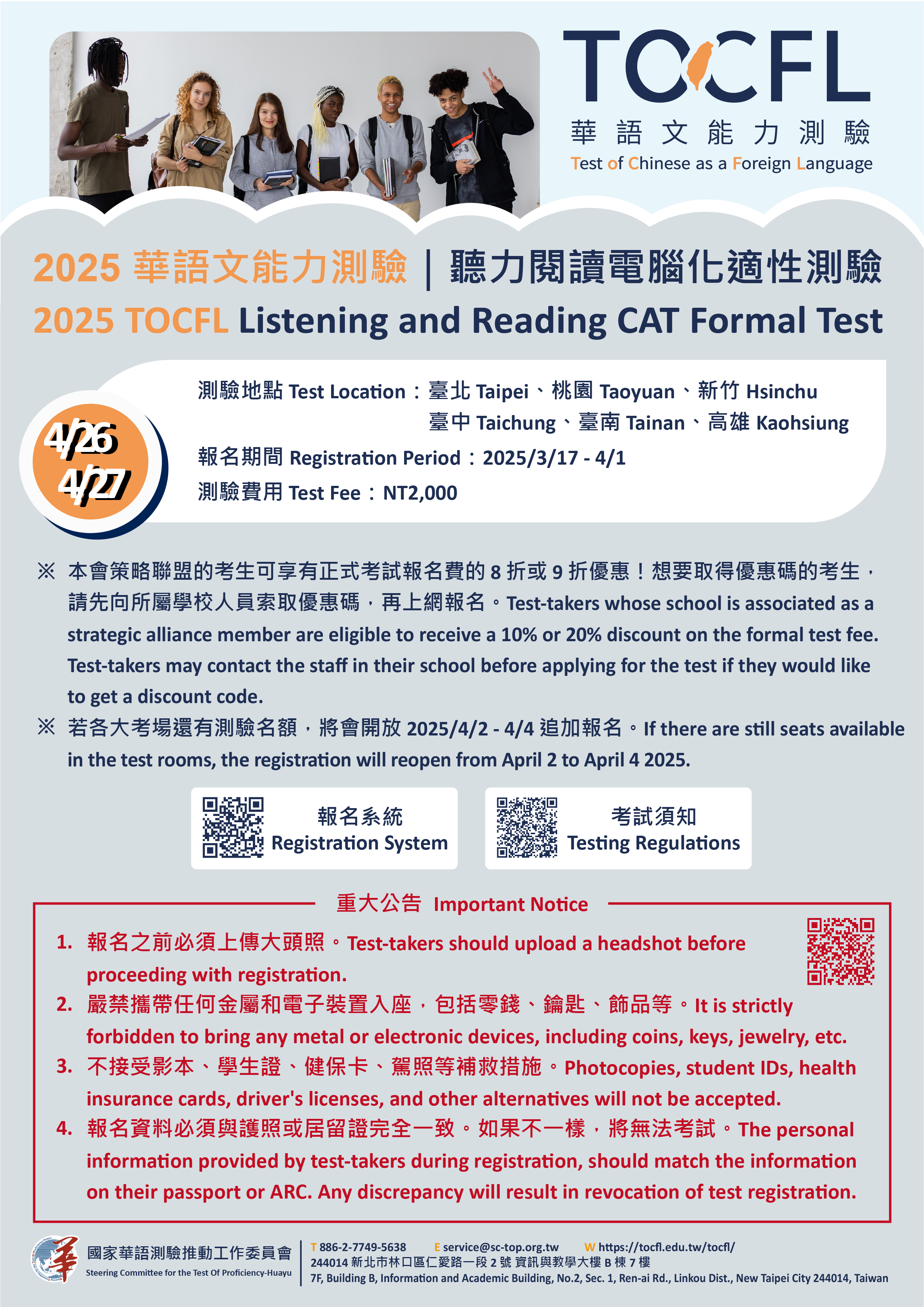 一、依據國家華語測驗推動工作委員會114年3月14日華測字第1142000043號函辦理。