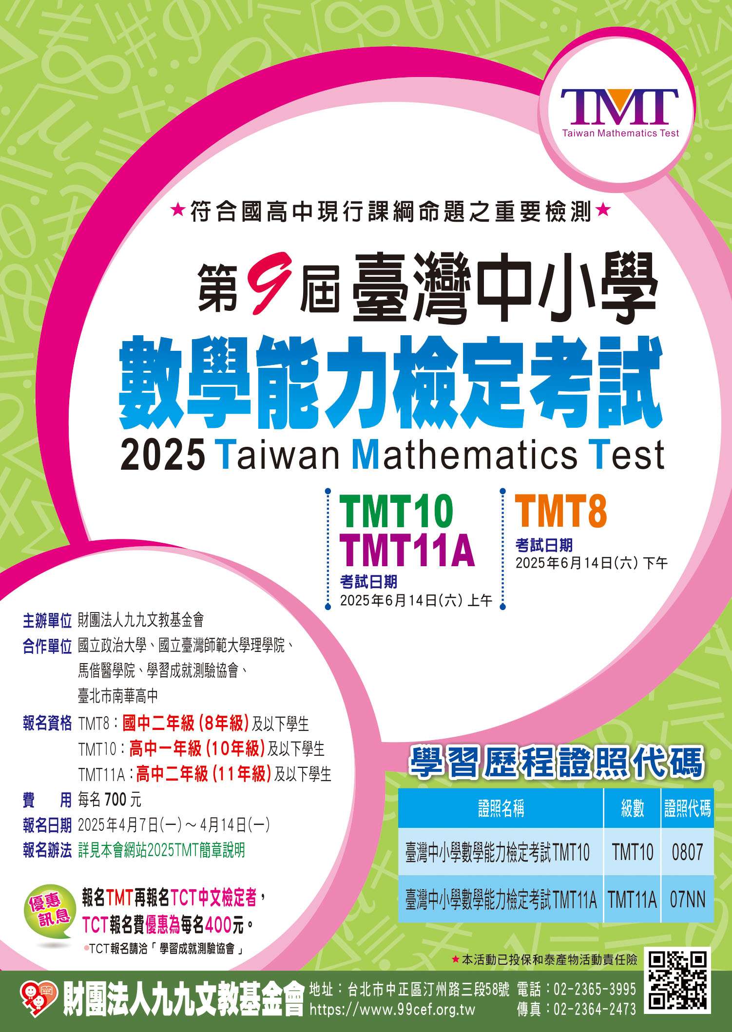 本會訂於民國114年6月14日(星期六)舉辦第九屆臺灣中小學數學能力檢定考試(Taiwan Mathematics Test, TMT),敬請 貴校鼓勵學生報名參加。