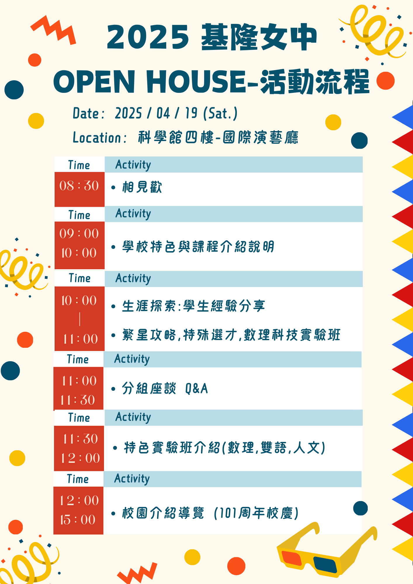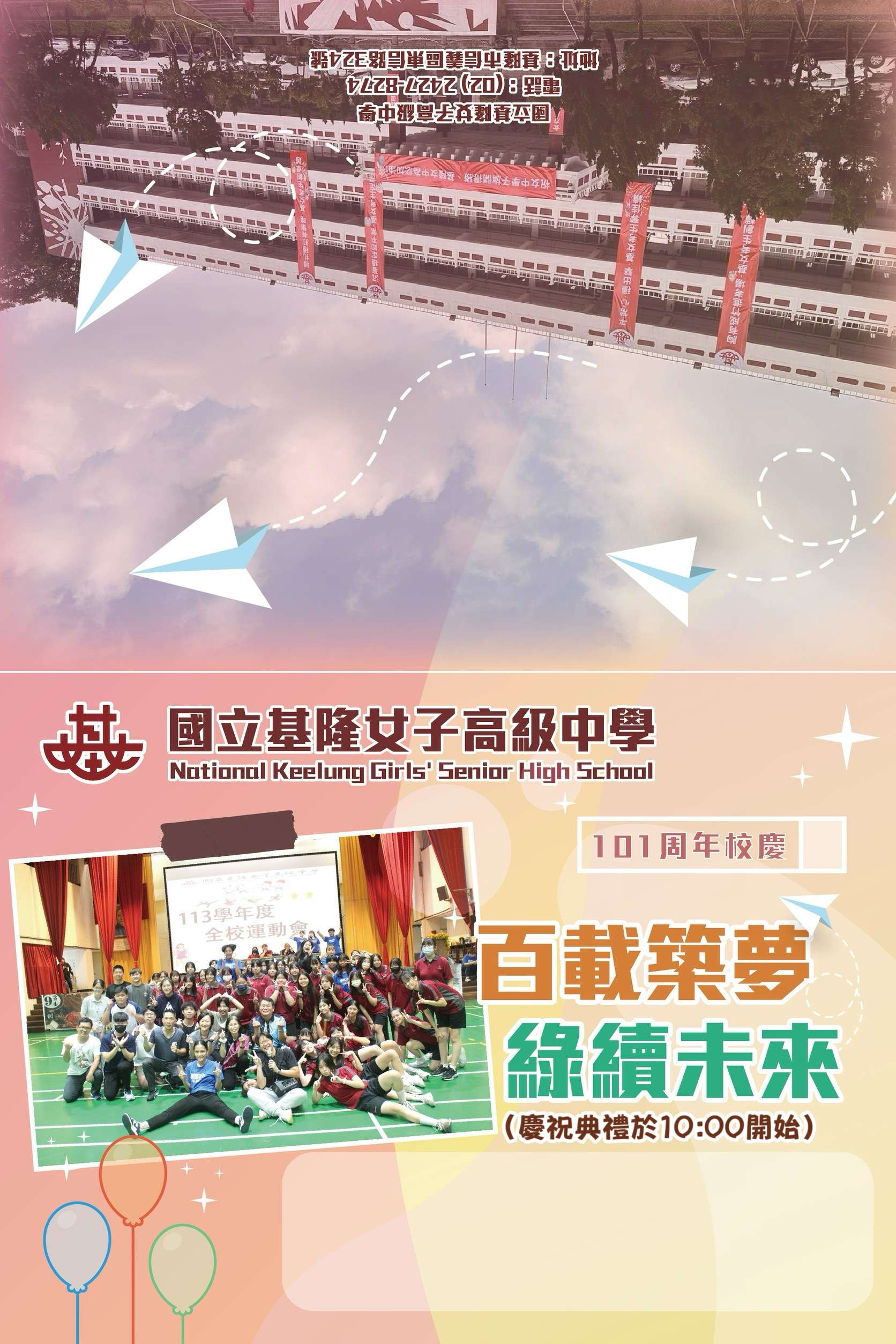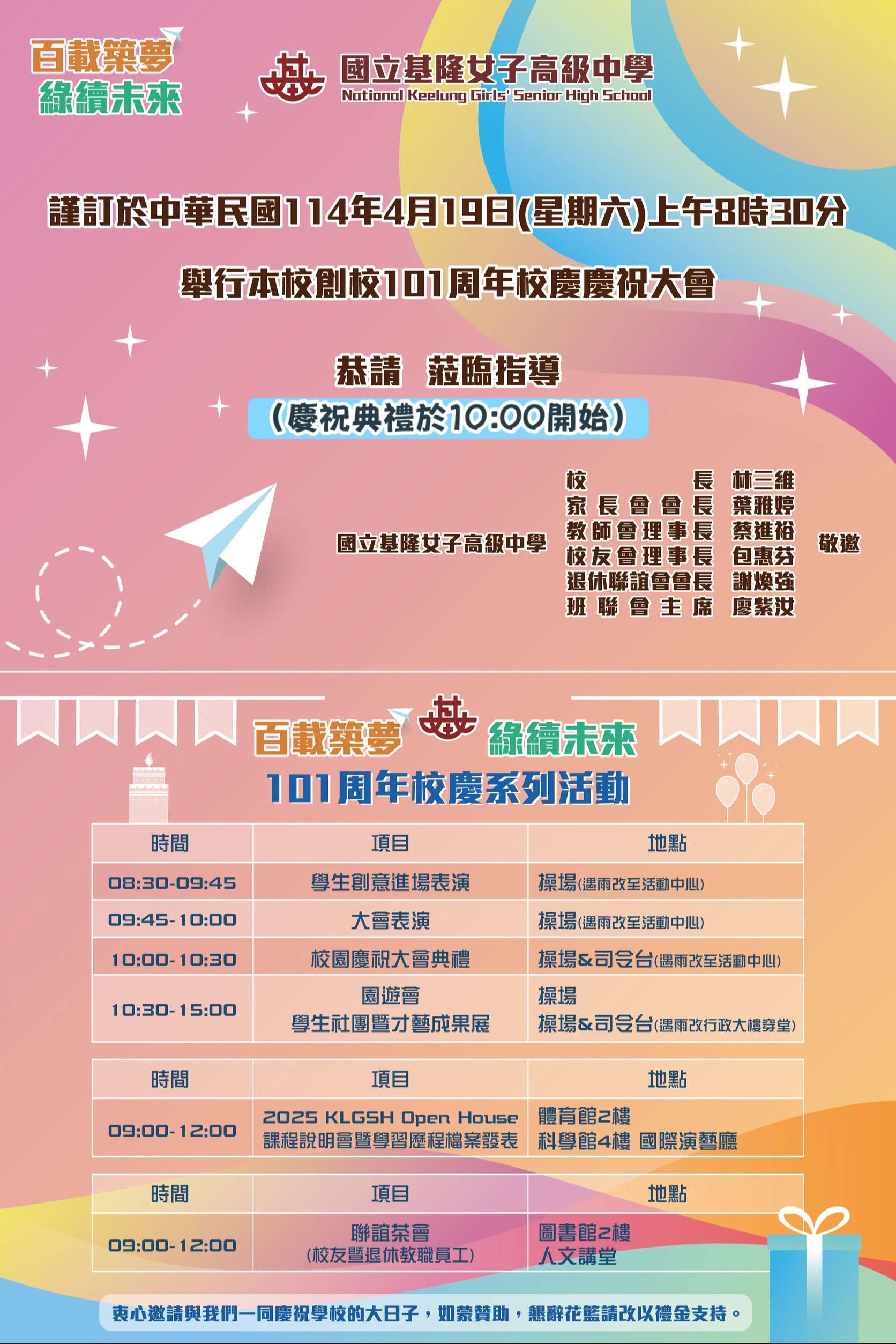 主旨:本校訂於114年4月19日(星期六)辦理「國立基隆女中創校 101周年校慶慶祝大會暨OPEN HOUSE校園開放日」,為推 廣在地就學,敬請惠予協助轉知並敬邀貴校學生及家長蒞 臨參加,請查照。