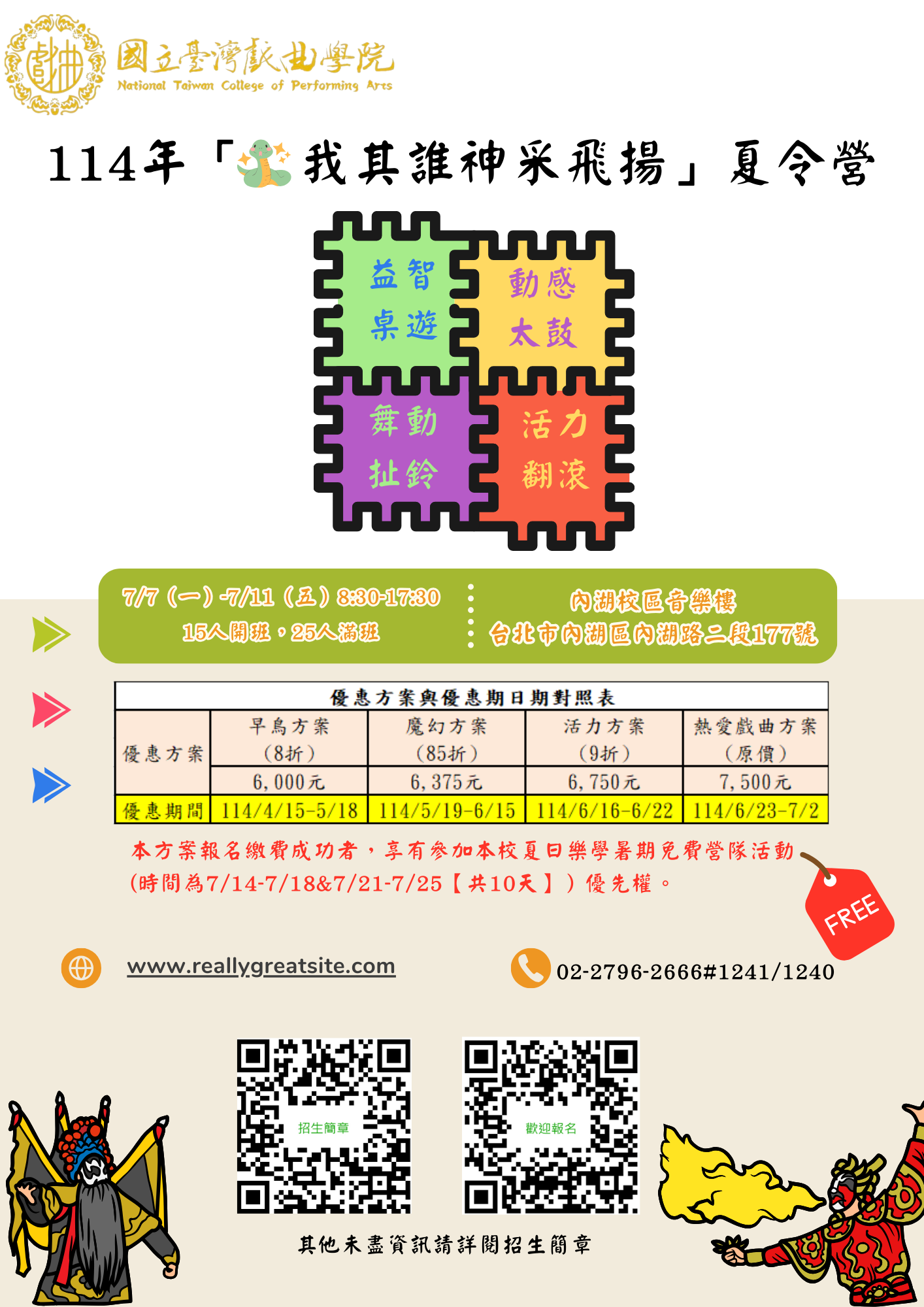 主旨:檢送國立臺灣戲曲學院「114年蛇我其誰神采飛揚夏令營」招生訊息轉知貴屬學生踴躍報名參加。