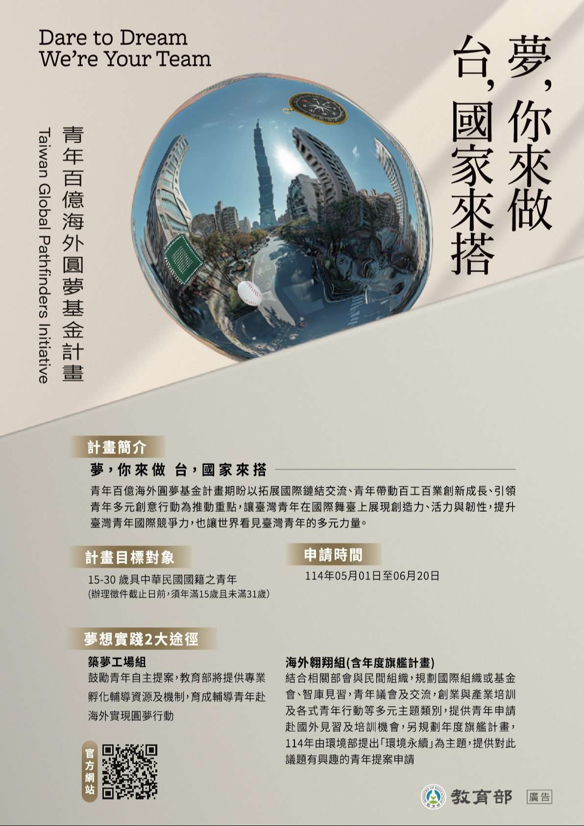 主旨:轉知教育部「青年百億海外圓夢基金計畫」第二梯次報名簡章及海報電子檔,鼓勵學生踴躍報名。