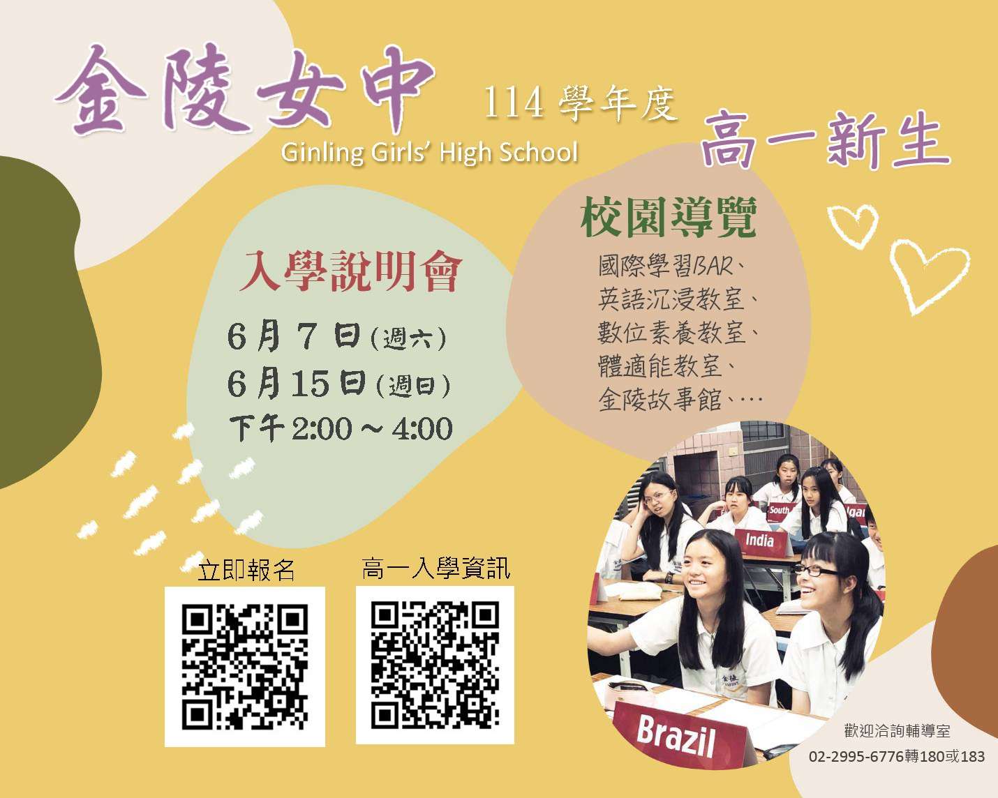 一、本校為提供國三家長及學生,了解金陵教育理念及特色課 程,特辦理校園參訪暨說明會,敬請協助公告並鼓勵踴躍 報名。
