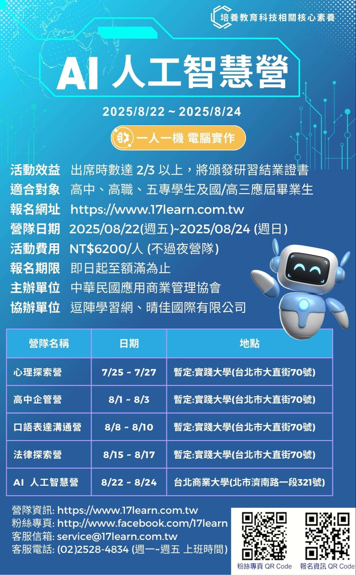 說明:人工智慧(AI)時代來襲,將為世界帶來顛覆性變革。因應 這樣的巨大科技浪潮,教育部自2020年起AI課程納入基礎 教育,透過跨部會整合及推動「台灣AI行動計畫」,盼將 台灣打造成全球AI人才重鎮。「AI人工智慧營」將透過三 天營期,讓學生對於科技發展大浪潮有初步的了解與體 認。
