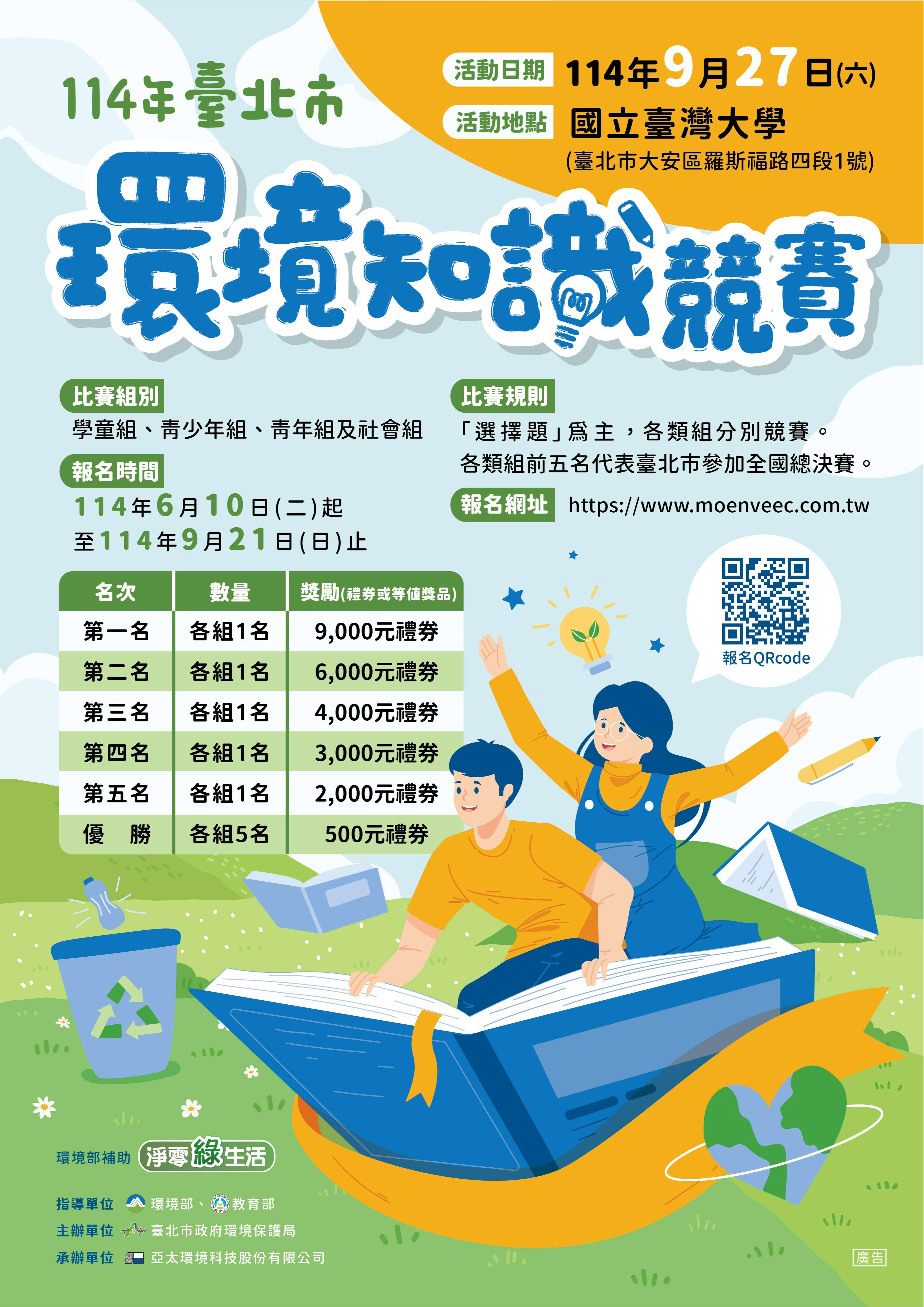 主旨:本市「114年環境知識競賽」訂於114年9月27日(星期六)假臺灣大學舉行,惠請貴校協助鼓勵校內師生踴躍報名參加。