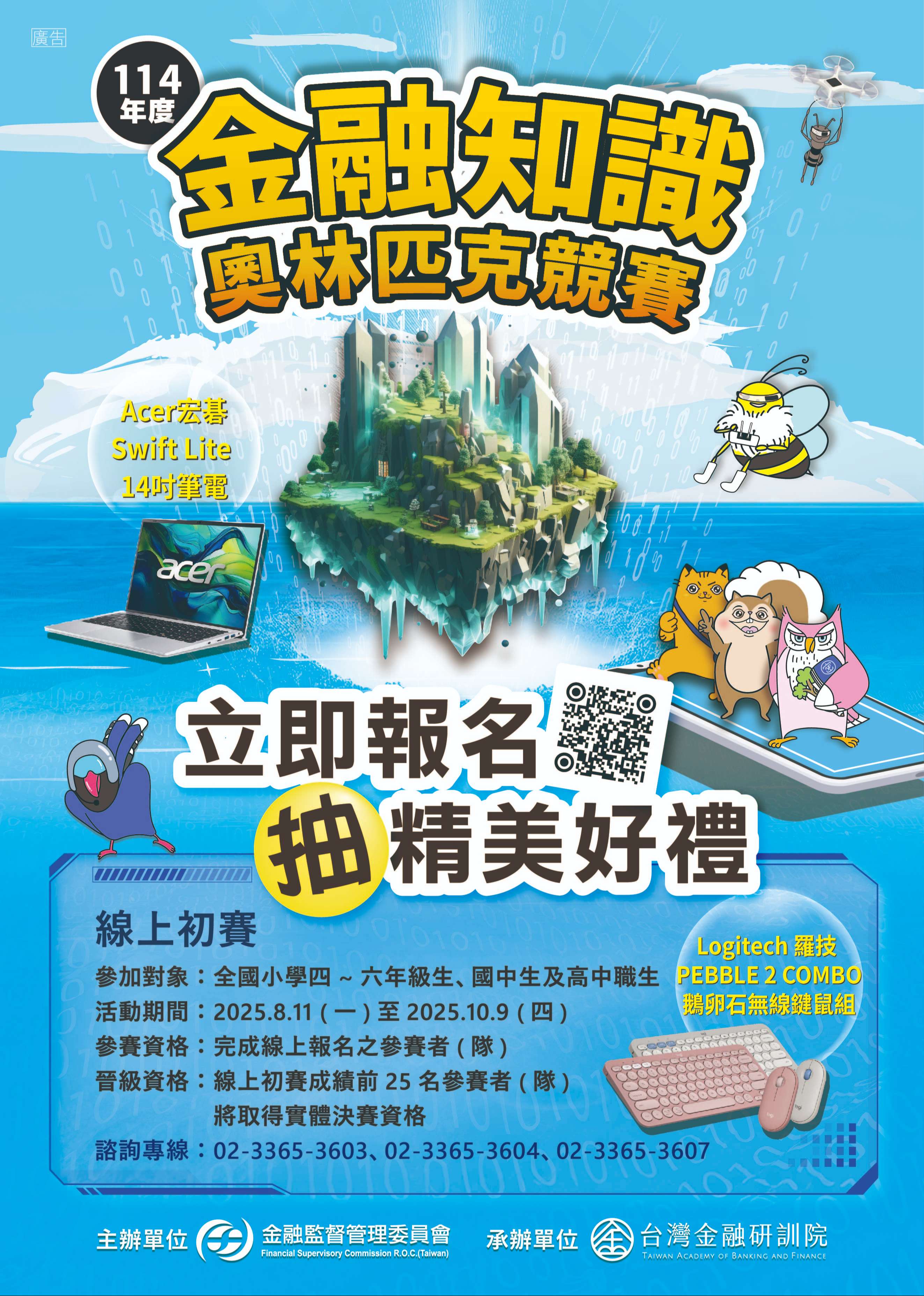 1、參加對象:全國國中、高中職一至三年級學生。 2、線上初賽期間:114年8月11日至10月9日。 3、活動方式:分為國中個人組、國中團體組、高中 職個人組、高中職團體組,線上初賽後擇優進入 實體決賽。