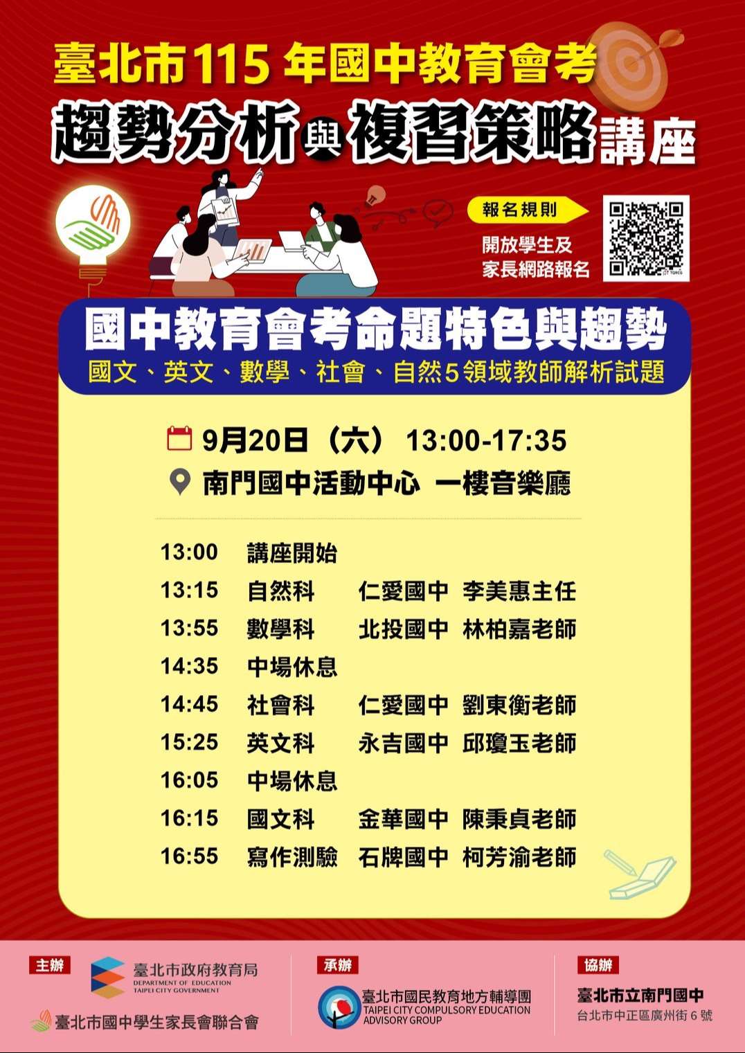 二、為協助本市國中考生及家長瞭解115年國中教育會考命題特色與趨勢,本局會同臺北市國中學生家長聯合會共同辦理旨揭講座。