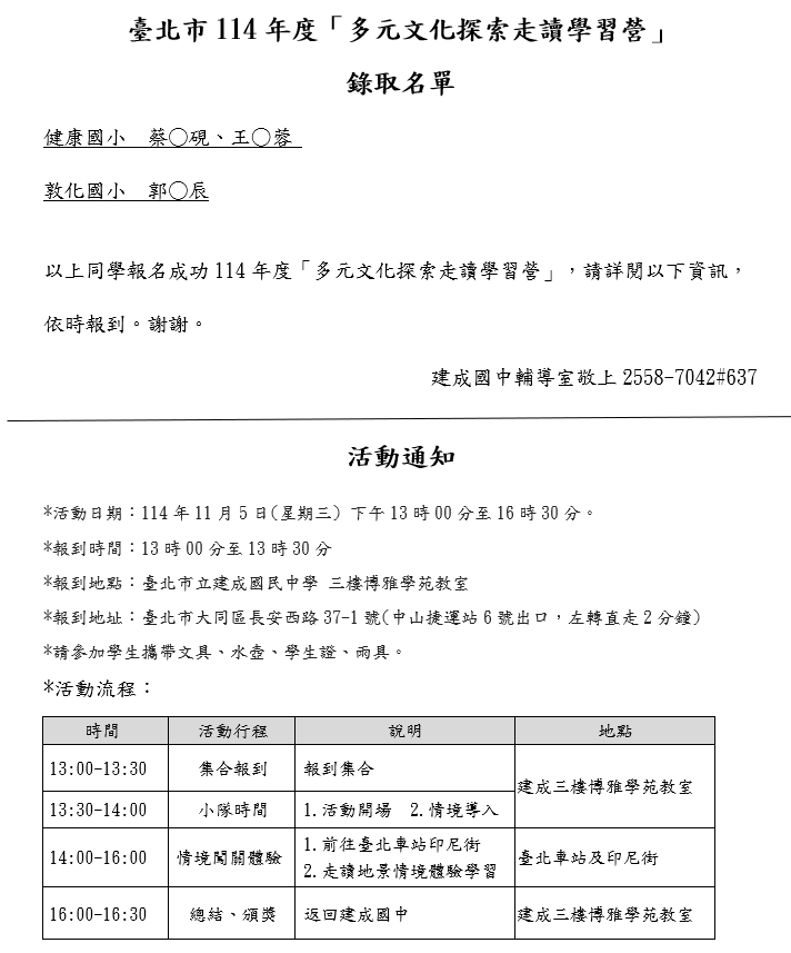 請參閱附檔,並於114年11月5日(星期三) 下午13時00分至13時30分到建成國中三樓博雅學苑教室報到。