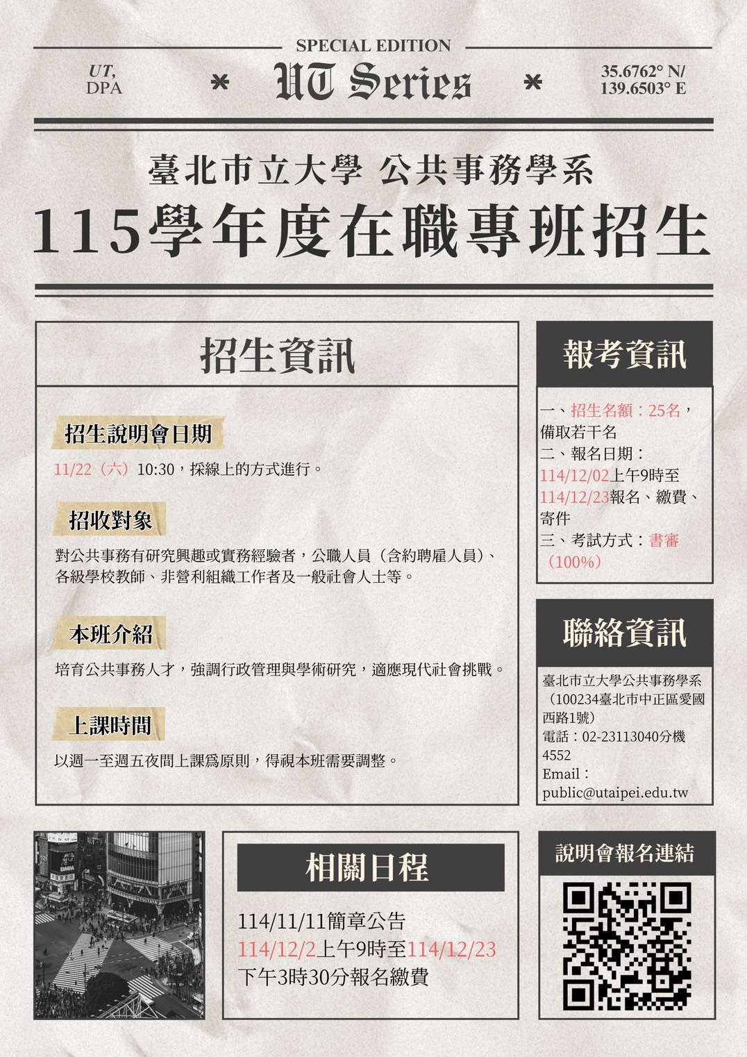 一、為培養公共事務人才,並鼓勵現職公務人員在職進修,充實專業知能,本系特辦理 115 學年度在職專班招生。